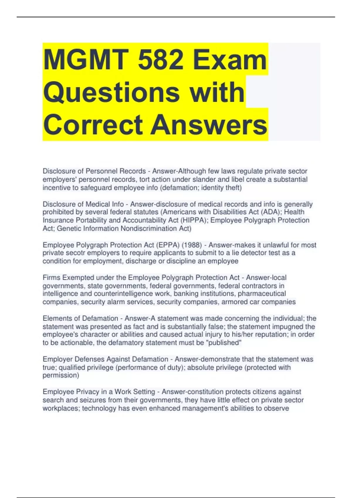 MGMT 582 Exam Questions with Correct Answers Disclosure of Personnel Records - Answer-Although few laws regulate private sector employers' personnel records, tort action under slander and libel create a substantial incentive to safeguard employee info (defamation; identity theft) Disclosure of Medical Info - Answer-disclosure of medical records and info is generally prohibited by several federal statutes (Americans with Disabilities Act (ADA); Health Insurance Portability and Accountability Act (HIPPA); Employee Polygraph Protection Act; Genetic Information Nondiscrimination Act) Employee Polygraph Protection Act (EPPA) (1988) - Answer-makes it unlawful for most private secotr employers to require applicants to submit to a lie detector test as a condition for employment, discharge or discipline an employee Firms Exempted under the Employee Polygraph Protection Act - Answer-local governments, state governments, federal governments, federal contractors in intelligence and counterintelligence work, banking institutions, pharmaceutical companies, security alarm services, security companies, armored car companies Elements of Defamation - Answer-A statement was made concerning the individual; the statement was presented as fact and is substantially false; the statement impugned the employee's character or abilities and caused actual injury to his/her reputation; in order to be actionable, the defamatory statement must be "published" Employer Defenses Against Defamation - Answer-demonstrate that the statement was true; qualified privilege (performance of duty); absolute privilege (protected with permission) Employee Privacy in a Work Setting - Answer-constitution protects citizens against search and seizures from their governments, they have little effect on private sector workplaces; technology has even enhanced management's abilities to observe employee activities and behavior through telephone, email, computer, and video monitoring Employee Monitoring Legal for Private Sector Employers - Answer-video monitors; oneway mirrors; ethical consideration-employees should be notified that they are being watched Employee Electronic Monitoring - Answer-computer files; email; ethical considerationemployees should be notified that they are being watched Email Monitoring - Answer-there is no reasonable expectations of privacy in email communications made on an employer's equipment; let employees know that this is not ____ communication and is subject to being monitored Employer Monitoring Practices - Answer-76% employers monitor employee internet usage; 36% track content, keystrokes, time online; 65% used blocking software; 50- 55% review employee emails and computer files; 26% have fired workers for misusing the internet; 25% have terminated employees for email misuse; 6% have fired employees for misusing office phones Video Monitoring - Answer-can be conducted on the justifications of security, employee safety, performance monitoring Workplace Searches - Answer-employer may search an employee's office, desk, or file cabinets for any work-related purpose that would seriously disrupt the routine conduct of business; avoid searches that are conducted for the purpose of acquiring nonworkrelated info