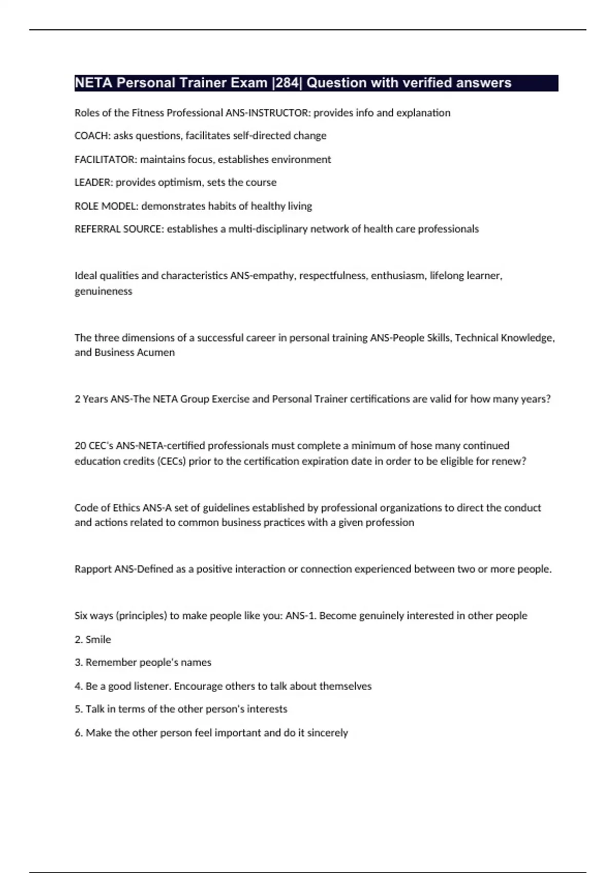 NETA Personal Trainer Exam |284| Question with verified answers Roles of the Fitness Professional ANS-INSTRUCTOR: provides info and explanation COACH: asks questions, facilitates self-directed change FACILITATOR: maintains focus, establishes environment LEADER: provides optimism, sets the course ROLE MODEL: demonstrates habits of healthy living REFERRAL SOURCE: establishes a multi-disciplinary network of health care professionals Ideal qualities and characteristics ANS-empathy, respectfulness, enthusiasm, lifelong learner, genuineness The three dimensions of a successful career in personal training ANS-People Skills, Technical Knowledge, and Business Acumen 2 Years ANS-The NETA Group Exercise and Personal Trainer certifications are valid for how many years? 20 CEC's ANS-NETA-certified professionals must complete a minimum of hose many continued education credits (CECs) prior to the certification expiration date in order to be eligible for renew? Code of Ethics ANS-A set of guidelines established by professional organizations to direct the conduct and actions related to common business practices with a given profession Rapport ANS-Defined as a positive interaction or connection experienced between two or more people. Six ways (principles) to make people like you: ANS-1. Become genuinely interested in other people 2. Smile 3. Remember people's names 4. Be a good listener. Encourage others to talk about themselves 5. Talk in terms of the other person's interests 6. Make the other person feel important and do it sincerely