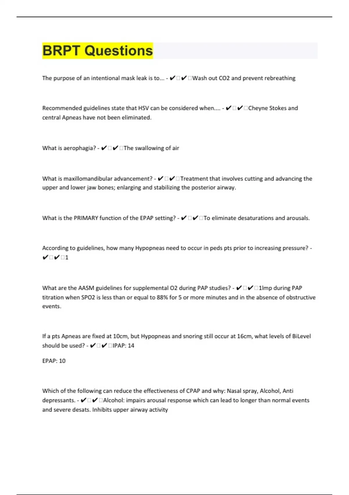The purpose of an intentional mask leak is to... - ️️Wash out CO2 and prevent rebreathing Recommended guidelines state that HSV can be considered when.... - ️️Cheyne Stokes and central Apneas have not been eliminated. What is aerophagia? - ️️The swallowing of air What is maxillomandibular advancement? - ️️Treatment that involves cutting and advancing the upper and lower jaw bones; enlarging and stabilizing the posterior airway. What is the PRIMARY function of the EPAP setting? - ️️To eliminate desaturations and arousals. According to guidelines, how many Hypopneas need to occur in peds pts prior to increasing pressure? - ️️1 What are the AASM guidelines for supplemental O2 during PAP studies? - ️️1lmp during PAP titration when SPO2 is less than or equal to 88% for 5 or more minutes and in the absence of obstructive events. If a pts Apneas are fixed at 10cm, but Hypopneas and snoring still occur at 16cm, what levels of BiLevel should be used? - ️️IPAP: 14 EPAP: 10 Which of the following can reduce the effectiveness of CPAP and why: Nasal spray, Alcohol, Anti depressants. - ️️Alcohol: impairs arousal response which can lead to longer than normal events and severe desats. Inhibits upper airway activity