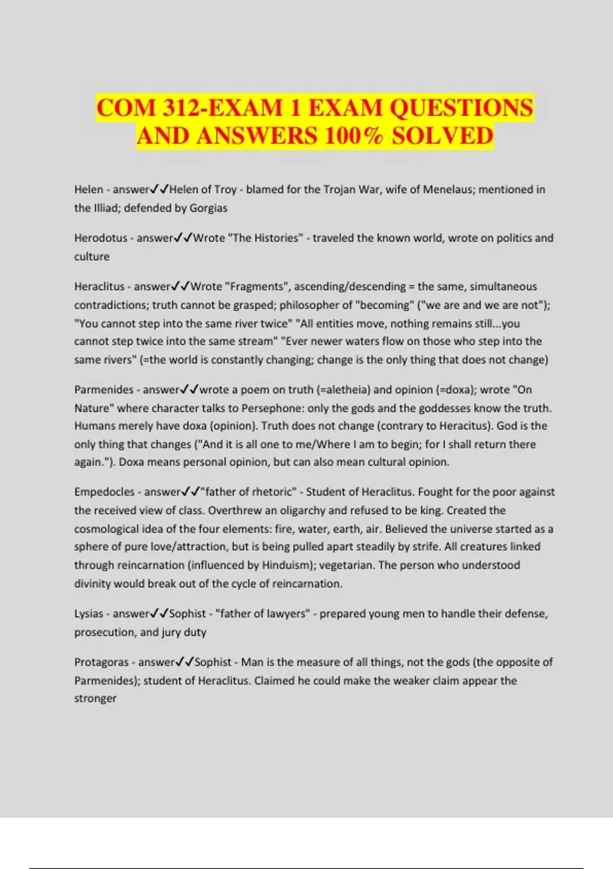 COM 312-EXAM 1 EXAM QUESTIONS AND ANSWERS 100% SOLVED Helen - answerHelen of Troy - blamed for the Trojan War, wife of Menelaus; mentioned in the Illiad; defended by Gorgias Herodotus - answerWrote "The Histories" - traveled the known world, wrote on politics and culture Heraclitus - answerWrote "Fragments", ascending/descending = the same, simultaneous contradictions; truth cannot be grasped; philosopher of "becoming" ("we are and we are not"); "You cannot step into the same river twice" "All entities move, nothing remains still...you cannot step twice into the same stream" "Ever newer waters flow on those who step into the same rivers" (=the world is constantly changing; change is the only thing that does not change) Parmenides - answerwrote a poem on truth (=aletheia) and opinion (=doxa); wrote "On Nature" where character talks to Persephone: only the gods and the goddesses know the truth. Humans merely have doxa (opinion). Truth does not change (contrary to Heracitus). God is the only thing that changes ("And it is all one to me/Where I am to begin; for I shall return there again."). Doxa means personal opinion, but can also mean cultural opinion. Empedocles - answer"father of rhetoric" - Student of Heraclitus. Fought for the poor against the received view of class. Overthrew an oligarchy and refused to be king. Created the cosmological idea of the four elements: fire, water, earth, air. Believed the universe started as a sphere of pure love/attraction, but is being pulled apart steadily by strife. All creatures linked through reincarnation (influenced by Hinduism); vegetarian. The person who understood divinity would break out of the cycle of reincarnation. Lysias - answerSophist - "father of lawyers" - prepared young men to handle their defense, prosecution, and jury duty Protagoras - answerSophist - Man is the measure of all things, not the gods (the opposite of Parmenides); student of Heraclitus. Claimed he could make the weaker claim appear the stronger Gorgias - answerSophist - Student of Empedocles, more interested in style than virtue. Developed or emphasized chiasmus (crossed phrasing, "Ask not what your country can do for you, but what you can do for your country"), kairos (timing), and dissoi logoi (opposing arguments); wrote "Encomium of Helen" Demosthenes - answerSophist - first speech early in life; learned by studying famous speeches. Tried to save Athens from Macedonians - failed. Had lisp; overcame by speaking with rocks in mouth; spoke at roar of waves and winds Isocrates - answerSophist - Student of Gorgias and Socrates. Opened a school of oratory and civic leadership. Wrote "Against the Sophists" (against the ones who were less interested in civic action or virtue, those who just took money). Focused on character-building and grounding in practical wisdom (phronesis). Developed Kairos further by adding idea of historical time. Aspasia - answerteacher of Socrates, taught men and women from her salon, may have been the source of the "Socratic method" Socrates - answerequated virtue and knowledge; known for Know Thyself; Challenged civic and religious institutions; Criticized the Sophists; Taught young students to question everything; accused for "corrupting the youth" and sentenced to death; Drank hemlock; did not write anything down Plato - answerWrote mostly in the form of dialogues (most famous for "The Republic"). Student of Socrates. Academy with both men and women, mostly upper class students, promoted the guardian class and the Philosopher Kings Aristotle - answerWrote "Rhetoric." Rhetoric's purpose: critique and make arguments, leads to the good life. Opposed Sophists. Encouraged virtue and human flourishing. Polyhistor (knowledgeable in many subjects) and encyclopedist. Thought women were "deformed males." Encouraged classism and ethnocentrism. Studied at the Academy. Taught Alexander; resisted Alexander's claim that he was a god. Life in danger; ran. Cicero - answerwrote De Oratore (the role of forensics is to restore justice; wants to unite philosophy and rhetoric); studied rhetoric & law (forensics), powerful (Consul), from the upper- middle class (equestrian class); wrote De Inventione (the five canons of rhetoric); exiled a lot because of parrhesia (speaking too boldly) Quintilian - answerwrote 12 volumes on rhetoric - lived under tyrant after Cicero, not as brave - defined rhetoric as the good man sp