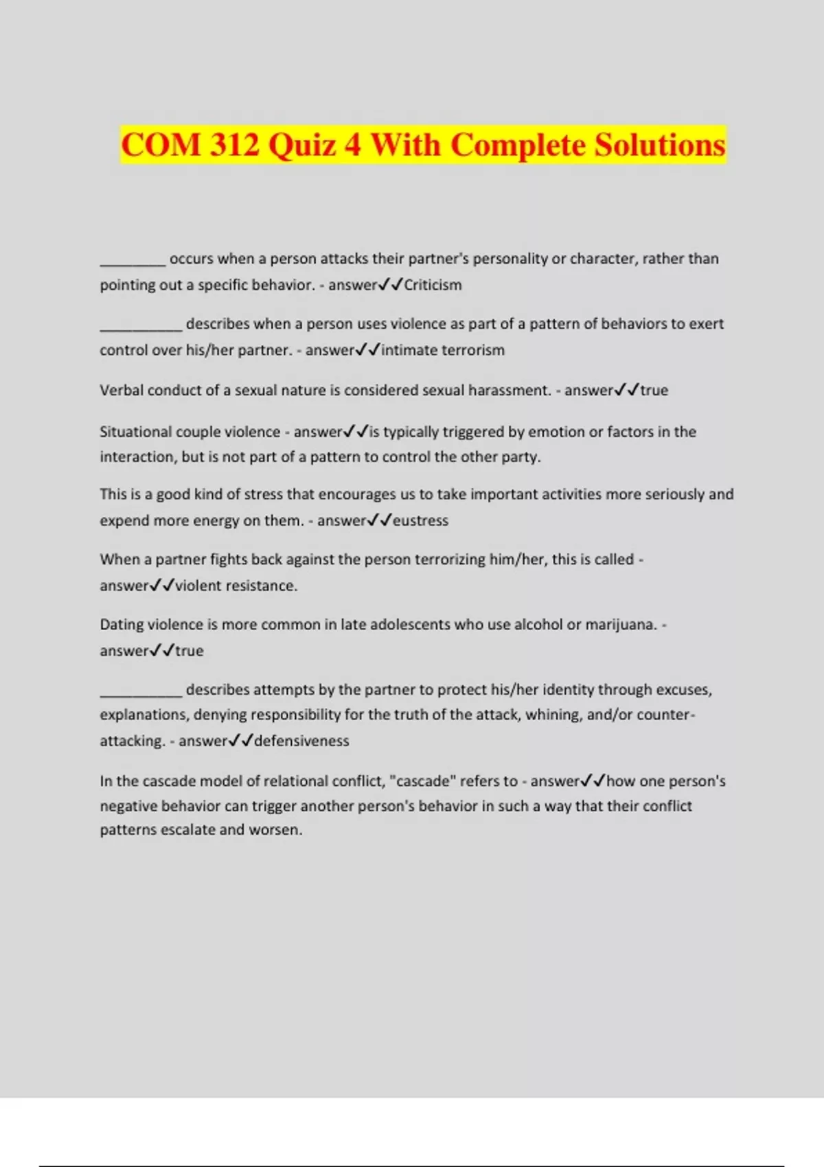 COM 312 Quiz 4 With Complete Solutions ________ occurs when a person attacks their partner's personality or character, rather than pointing out a specific behavior. - answerCriticism __________ describes when a person uses violence as part of a pattern of behaviors to exert control over his/her partner. - answerintimate terrorism Verbal conduct of a sexual nature is considered sexual harassment. - answertrue Situational couple violence - answeris typically triggered by emotion or factors in the interaction, but is not part of a pattern to control the other party.