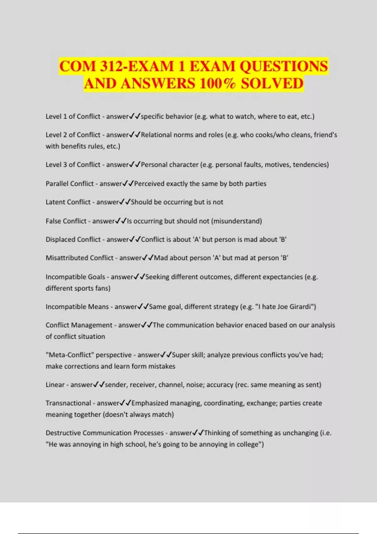COM 312-EXAM 1 EXAM QUESTIONS AND ANSWERS 100% SOLVED Level 1 of Conflict - answerspecific behavior (e.g. what to watch, where to eat, etc.) Level 2 of Conflict - answerRelational norms and roles (e.g. who cooks/who cleans, friend's with benefits rules, etc.) Level 3 of Conflict - answerPersonal character (e.g. personal faults, motives, tendencies) Parallel Conflict - answerPerceived exactly the same by both parties Latent Conflict - answerShould be occurring but is not False Conflict - answerIs occurring but should not (misunderstand) Displaced Conflict - answerConflict is about 'A' but person is mad about 'B' Misattributed Conflict - answerMad about person 'A' but mad at person 'B' Incompatible Goals - answerSeeking different outcomes, different expectancies (e.g. different sports fans) Incompatible Means - answerSame goal, different strategy (e.g. "I hate Joe Girardi") Conflict Management - answerThe communication behavior enaced based on our analysis of conflict situation "Meta-Conflict" perspective - answerSuper skill; analyze previous conflicts you've had; make corrections and learn form mistakes Linear - answersender, receiver, channel, noise; accuracy (rec. same meaning as sent) Transnactional - answerEmphasized managing, coordinating, exchange; parties create meaning together (doesn't always match) Destructive Communication Processes - answerThinking of something as unchanging (i.e. "He was annoying in high school, he's going to be annoying in college") Ignoring/forgetting our histories - answer"I don't understand why she's being so mean, that happened like forever ago" Process View of Communication - answerRealizing that our lives consists of events which influence subsequent events Prelude to conflict - answerVariables emerge that make conflict possible Four Key Variables - answer1. Who is in the conflict? 2. What type of relationship do they share? 3. Who else is involved (bystan