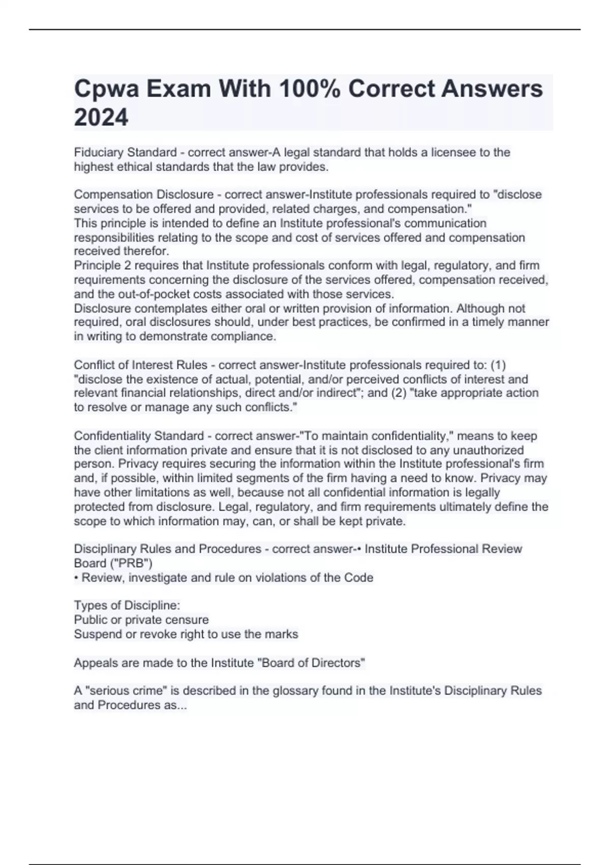 Fiduciary Standard - correct answer-A legal standard that holds a licensee to the highest ethical standards that the law provides. Compensation Disclosure - correct answer-Institute professionals required to "disclose services to be offered and provided, related charges, and compensation." This principle is intended to define an Institute professional's communication responsibilities relating to the scope and cost of services offered and compensation received therefor. Principle 2 requires that Institute professionals conform with legal, regulatory, and firm requirements concerning the disclosure of the services offered, compensation received, and the out-of-pocket costs associated with those services. Disclosure contemplates either oral or written provision of information. Although not required, oral disclosures should, under best practices, be confirmed in a timely manner in writing to demonstrate compliance. Conflict of Interest Rules - correct answer-Institute professionals required to: (1) "disclose the existence of actual, potential, and/or perceived conflicts of interest and relevant financial relationships, direct and/or indirect"; and (2) "take appropriate action to resolve or manage any such conflicts." Confidentiality Standard - correct answer-"To maintain confidentiality," means to keep the client information private and ensure that it is not disclosed to any unauthorized person. Privacy requires securing the information within the Institute professional's firm and, if possible, within limited segments of the firm having a need to know. Privacy may have other limitations as well, because not all confidential information is legally protected from disclosure. Legal, regulatory, and firm requirements ultimately define the scope to which information may, can, or shall be kept private. Disciplinary Rules and Procedures - correct answer-• Institute Professional Review Board ("PRB") • Review, investigate and rule on violations of the Code Types of Discipline: Public or private censure Suspend or revoke right to use the marks Appeals are made to the Institute "Board of Directors" A "serious crime" is described in the glossary found in the Institute's Disciplinary Rules and Procedures as...