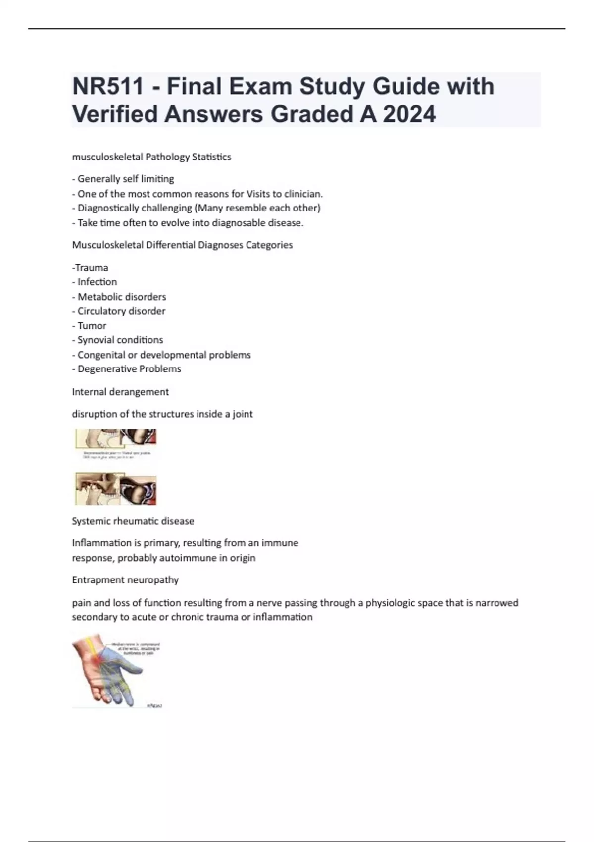 musculoskeletal Pathology Statistics - Generally self limiting - One of the most common reasons for Visits to clinician. - Diagnostically challenging (Many resemble each other) - Take time often to evolve into diagnosable disease. Musculoskeletal Differential Diagnoses Categories -Trauma - Infection - Metabolic disorders - Circulatory disorder - Tumor - Synovial conditions - Congenital or developmental problems - Degenerative Problems Internal derangement disruption of the structures inside a joint Systemic rheumatic disease Inflammation is primary, resulting from an immune response, probably autoimmune in origin Entrapment neuropathy pain and loss of function resulting from a nerve passing through a physiologic space that is narrowed secondary to acute or chronic trauma or inflammation gouty arthritis (gout) inflammation and painful swelling of joints caused by excessive uric acid in the body paraneoplastic syndrome medical condition caused by tumor secretions (hormones, cytokines, TNF, Interleukin-1), may cause hypercalcermia, hypoglycemia, SIADH Mononeuritis inflammation of a single nerve radiculopathy (radiculitis) inflammation of the nerve root associated with the spinal column myelopathy any pathologic change or disease in the spinal cord transverse myelitis inflammation of the spinal cord reflex sympathetic dystrophy - Increase in sympathetic activity causing a release of norepinephrine in periphery and subsequent vasoconstriction of blood vessels resulting in pain and increase in sensitivity to peripheral stimulation. intense burning and pain in affected extremity, spreads proximally Giant cell arteritis temporal artery granulomatous vasculitis; ipsilateral blindness (ophthalmic artery) compartment syndrome involves the compression of nerves and blood vessels due to swelling within the enclosed space created by the fascia that separates groups of muscles