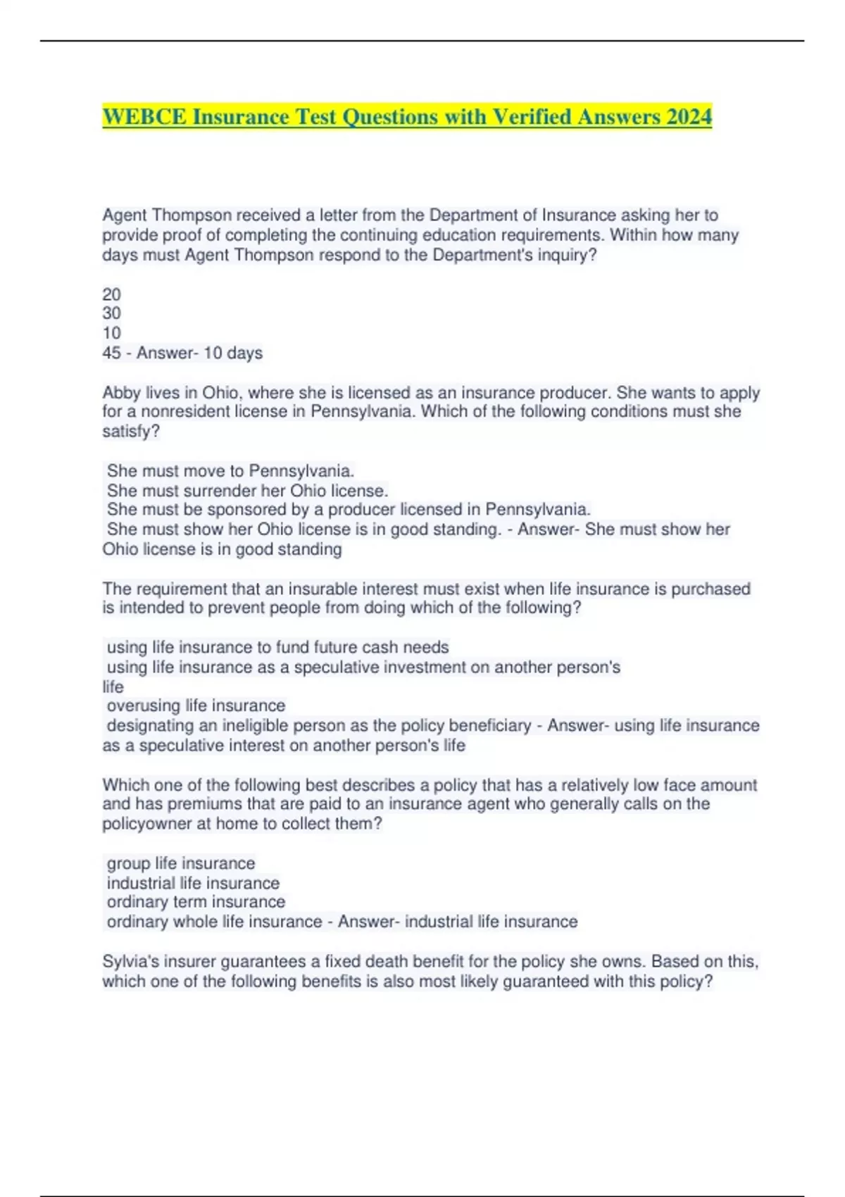 WEBCE Insurance Test Questions with Verified Answers 2024