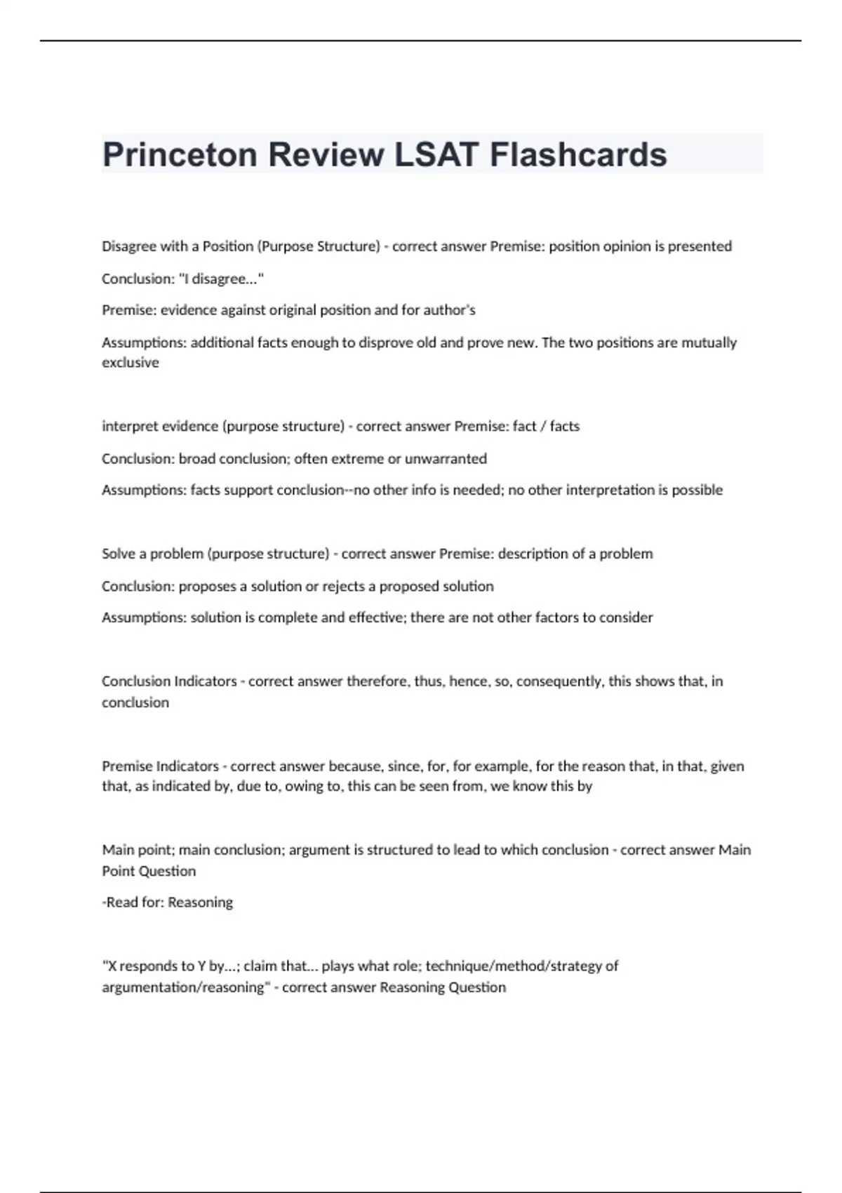 Disagree with a Position (Purpose Structure) - correct answer Premise: position opinion is presented Conclusion: "I disagree..." Premise: evidence against original position and for author's Assumptions: additional facts enough to disprove old and prove new. The two positions are mutually exclusive interpret evidence (purpose structure) - correct answer Premise: fact / facts Conclusion: broad conclusion; often extreme or unwarranted Assumptions: facts support conclusion--no other info is needed; no other interpretation is possible Solve a problem (purpose structure) - correct answer Premise: description of a problem Conclusion: proposes a solution or rejects a proposed solution Assumptions: solution is complete and effective; there are not other factors to consider Conclusion Indicators - correct answer therefore, thus, hence, so, consequently, this shows that, in conclusion Premise Indicators - correct answer because, since, for, for example, for the reason that, in that, given that, as indicated by, due to, owing to, this can be seen from, we know this by Main point; main conclusion; argument is structured to lead to which conclusion - correct answer Main Point Question -Read for: Reasoning "X responds to Y by...; claim that... plays what role; technique/method/strategy of argumentation/reasoning" - correct answer Reasoning Question -Read for: reasoning Assumption on which the argument depends/relies; assumption required - correct answer Necessary Assumption Question -Read for: reasoning if assumed the conclusion to follow logically; allows the conclusion to be properly drawn - correct answer Sufficient Assumption Question -Read for: reasoning most supports/justifies the argument above; most strengthens - correct answer Strengthen Question -Read for: reasoning Principle that, if valid, justifies the argument - correct answer Principle-Strengthen Question -Read for: reasoning most undermines, calls into question, casts doubt on - correct answer Weaken Question -Read for: reasoning "flaw, error in reasoning, vulnerable to criticism" - correct answer Flaw Question -Read for: reasoning Statements above, if true, support; must/could be true/false - correct answer Inference Question -Read for: information committed to disagreeing about - correct answer Point-at-issue Question -Read for: reasoning / information puzzling statement, apparent contradiction, paradox, resolution, explanation - correct answer Resolve / Explain Question -read for: information Most analogous; similar pattern of reasoning - correct answer Parallel Question -Read for: reasoning conforms/illustrates . . . principle/proposition - correct answer Principle-Match Question -Read for: (sometimes reasoning) Help Questions - correct answer Ask you to find an answer that supports the conclusion Hurt Questions - correct answer ask you to find an answer choice that weakens the conclusion Match Questions - correct answer ask you to find an answer choice that matches the conclusion or a part of the argument Extract Questions - correct answer ask you to find an answer choice that you know to be true based on the information in the argument are (negation) - correct answer are not helps (negation) - correct answer does not help contains more than (negation) - correct answer contains less than or equal to sometimes (negation) - correct answer never never (negation) - correct answer sometimes always (negation) - correct answer sometimes