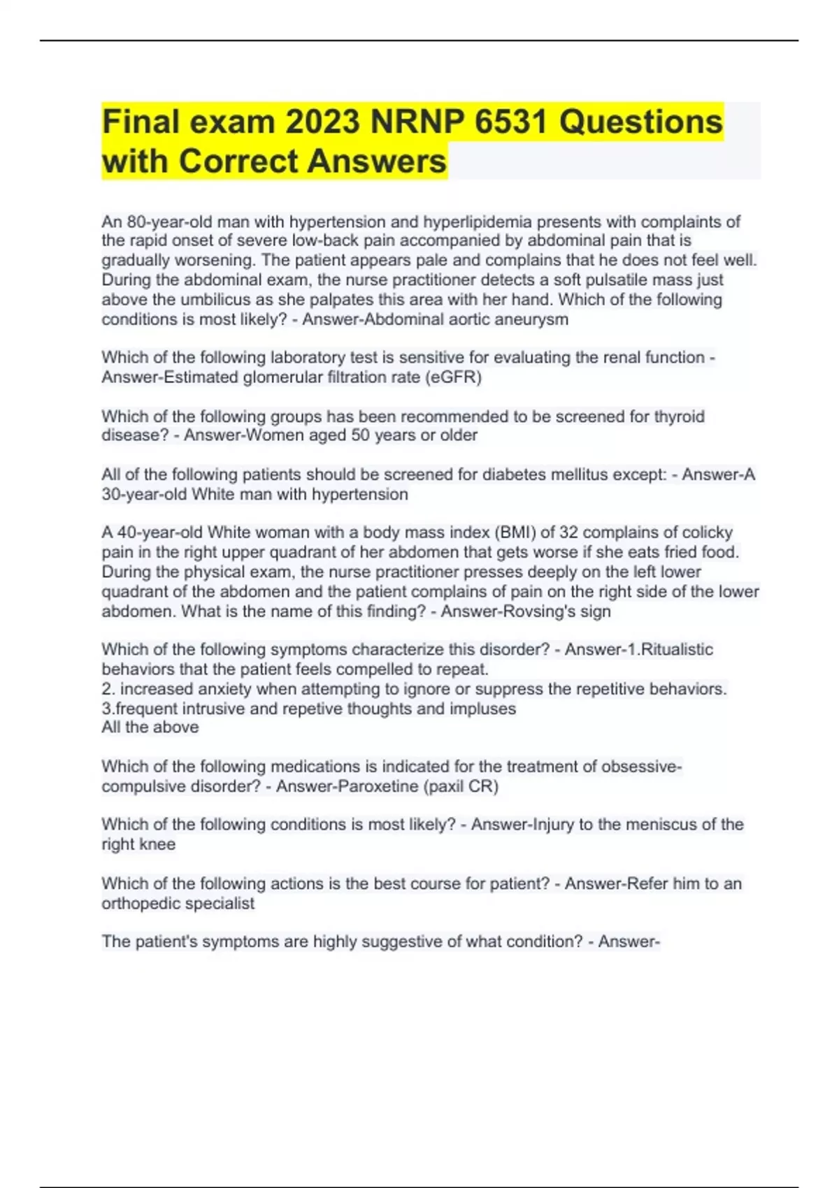 An 80-year-old man with hypertension and hyperlipidemia presents with complaints of the rapid onset of severe low-back pain accompanied by abdominal pain that is gradually worsening. The patient appears pale and complains that he does not feel well. During the abdominal exam, the nurse practitioner detects a soft pulsatile mass just above the umbilicus as she palpates this area with her hand. Which of the following conditions is most likely? - Answer-Abdominal aortic aneurysm Which of the following laboratory test is sensitive for evaluating the renal function - Answer-Estimated glomerular filtration rate (eGFR) Which of the following groups has been recommended to be screened for thyroid disease? - Answer-Women aged 50 years or older All of the following patients should be screened for diabetes mellitus except: - Answer-A 30-year-old White man with hypertension A 40-year-old White woman with a body mass index (BMI) of 32 complains of colicky pain in the right upper quadrant of her abdomen that gets worse if she eats fried food. During the physical exam, the nurse practitioner presses deeply on the left lower quadrant of the abdomen and the patient complains of pain on the right side of the lower abdomen. What is the name of this finding? - Answer-Rovsing's sign Which of the following symptoms characterize this disorder? - Answer-1.Ritualistic behaviors that the patient feels compelled to repeat. 2. increased anxiety when attempting to ignore or suppress the repetitive behaviors. ent intrusive and repetive thoughts and impluses All the above Which of the following medications is indicated for the treatment of obsessive-compulsive disorder? - Answer-Paroxetine (paxil CR) Which of the following conditions is most likely? - Answer-Injury to the meniscus of the right knee Which of the following actions is the best course for patient? - Answer-Refer him to an orthopedic specialist The patient's symptoms are highly suggestive of what condition? - Answer-