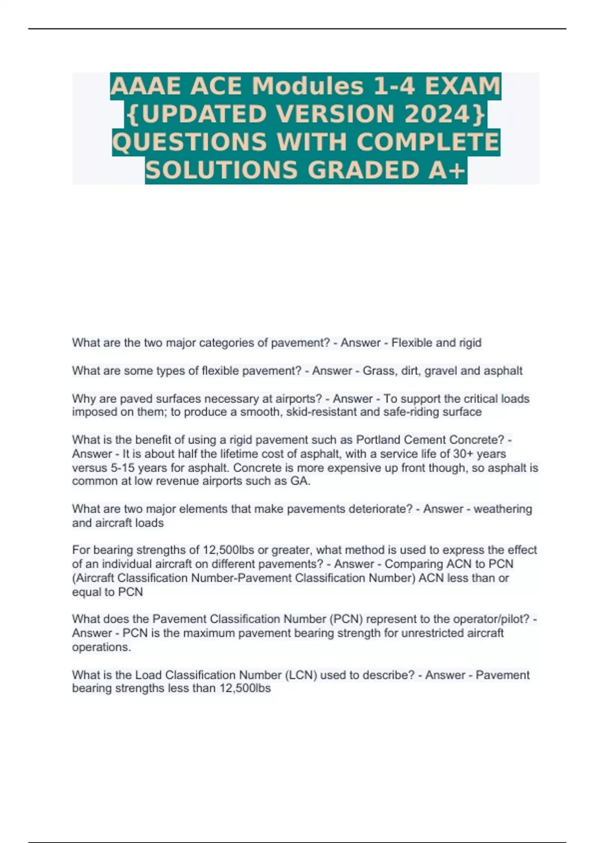 AAAE ACE Modules 1-4 EXAM {UPDATED VERSION 2024} QUESTIONS WITH COMPLETE SOLUTIONS GRADED A+ Sample Question & Answer: When must an airport operator conduct an airfield self-inspection? - Answer - daily; when required by an unusual condition; immediately after an accident or incident