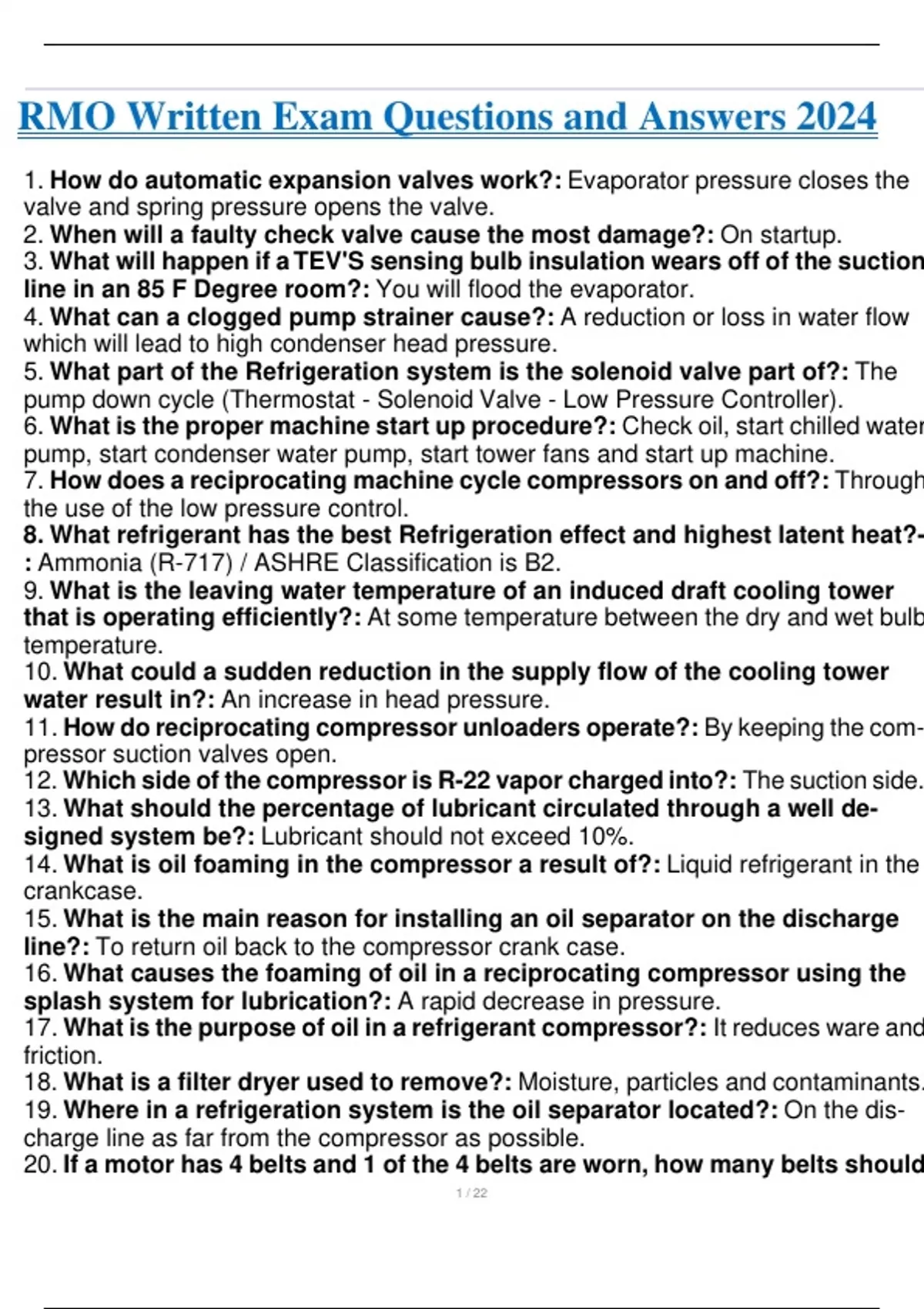 RMO Written Exam Questions and Answers 2024 1. How do automatic expansion valves work?: Evaporator pressure closes the valve and spring pressure opens the valve. 2. When will a faulty check valve cause the most damage?: On startup. 3. What will happen if a TEV'S sensing bulb insulation wears off of the suction line in an 85 F Degree room?: You will flood the evaporator. 4. What can a clogged pump strainer cause?: A reduction or loss in water flow which will lead to high condenser head pressure. 5. What part of the Refrigeration system is the solenoid valve part of?: The pump down cycle (Thermostat - Solenoid Valve - Low Pressure Controller). 6. What is the proper machine start up procedure?: Check oil, start chilled water pump, start condenser water pump, start tower fans and start up machine. 7. How does a reciprocating machine cycle compressors on and off?: Through the use of the low pressure control. 8. What refrigerant has the best Refrigeration effect and highest latent heat? - : Ammonia (R -717) / ASHRE Classification is B2. 9. What is the leaving water temperature of an induced draft cooling tower that is operating efficiently?: At some temperature between the dry and wet bulb temperature. 10. What could a sudden reduction in the supply flow of the cooling tower water result in?: An increase in head pressure. 11. How do reciprocating compressor unloaders operate?: By keeping the com- pressor suction valves open. 12. Which side of the compressor is R-22 vapor charged into?: The suction side. 13. What should the percentage of lubricant circulated through a well de- signed system be?: Lubricant should not exceed 10%. 14. What is oil foaming in the compressor a result of?: Liquid refrigerant in the crankcase. 15. What is the main reason for installing an oil separator on the discharge line?: To return oil back to the compressor crank case. 16. What causes the foaming of oil in a reciprocating compressor using the splash system for lubrication?: A rapid decrease in pressure. 17. What is the purpose of oil in a refrigerant compressor?: It reduces ware and friction. 18. What is a filter dryer used to remove?: Moisture, particles and contaminants. 19. Where in a refrigeration system is the oil separator located?: On the dis- charge line as far from the compressor as possible. 20. If a motor has 4 belts and 1 of the 4 belts are worn, how many belts should be replaced?: All of the belts should be replaced. 21. Does a solenoid valve vary or control the flow of refrigerant?: No. 22. What accessory meters and controls the flow of refrigerant into the evap - orator?: The TEV (Metering Device). 23. What will occur if you use an automatic expansion valve with a variable load?: You will starve the evaporator. 24. What does an automatic expansion valve do?: It maintains a constant evap - orator pressure. 25. What could cause the evaporator to not respond to the adjustments of the TEV?: Oil logged on the low side. 26. What can non-condensible's cause?: High head pressure. 27. When will compressor motor horsepower increase?: It will increase as the head pressure increases. 28. When will compressor motor horsepower decrease?: As the suction pres- sure increases. 29. When using a brine solution in a system what can be used to prevent rusting?: Di-Chromate Tablets. 30. What would cause a Halide torch flame to turn yellow?: A clogged sample tube. 31. What is the purpose of having 2 compressors in a cascade system?: To operate and very low temperatures and avoid high compression ratio. 32. Why is a pressure relief valve better than a fusible plug?: Because it can be re-seated and is cost efficient. 33. What could cause compressor knocking?: Liquid refrigerant slugging the compressor. 34. What would occur if a TEV'S spring were to break?: It would flood the evaporator and raise the suction pressure because a TEV uses spring pressure as its closing force. Thus, if the spring does not close the TEV refrigerant will constantly be metered into the evaporator. 35. What is the purpose of the TEV equalizer line?: It compensates for the pressure drop in the evaporator. Simply put, it equalizes pressure drop lost across the evaporator. 36. What should be done when installing copper pipe and a 90 degree elbow is needed?: You should BRAZE in a FACTORY MADE 90 degree elbow. 37. What is the purpose of a service valve stem cap?: It protects the valve from refrigerant leakage. 38. What advantage do semi hermetic compressor's have over hermetic com- pressor's?: Semi hermetic compressor's can be serviced. 39. What happens when using portable compressor recovery unit to remove vapor?: The vapor density is decreased. 40. What is the purpose of an unloader?: To decrease capacity (capacity control). 41. What determines the amount of pressure that flows through the orifice plates?: The difference in pressure between the high side and the low side of the system. 42. How can you check proper operation of a thermometer?: Local 94 answer - Place it in a container with ice water. Turner answer - Place it on an open container of boiling water. 43. How many phases will a 3 HP motor use?: 3 Phases. 44. If you were running 3 compressors what would the state of the refrigerant be leaving the 3rd evaporator coil?: It would be a slightly superheated vapor. 45. What does a TEV do?: It restricts the amount of refrigerant that flows from the high side to the low side. 46. When does a halide torch turn from blue to green or purple?: When a leak is detected. 47. What does a rectifier do?: It converts AC voltage to DC voltage. 48. What is the function of a thermostat?: It's purpose is to cycle the compressor on and off. 49. What is the main purpose for a crankcase breather line?: The main purpose is to prevent oil from slugging the compressor. 50. Where can the middle port on manifold gauges be connected to?: It can be connected to the recovery machine, charging cylinder or vacuum pump. 51. Why is a forced draft cooling tower better than a natur