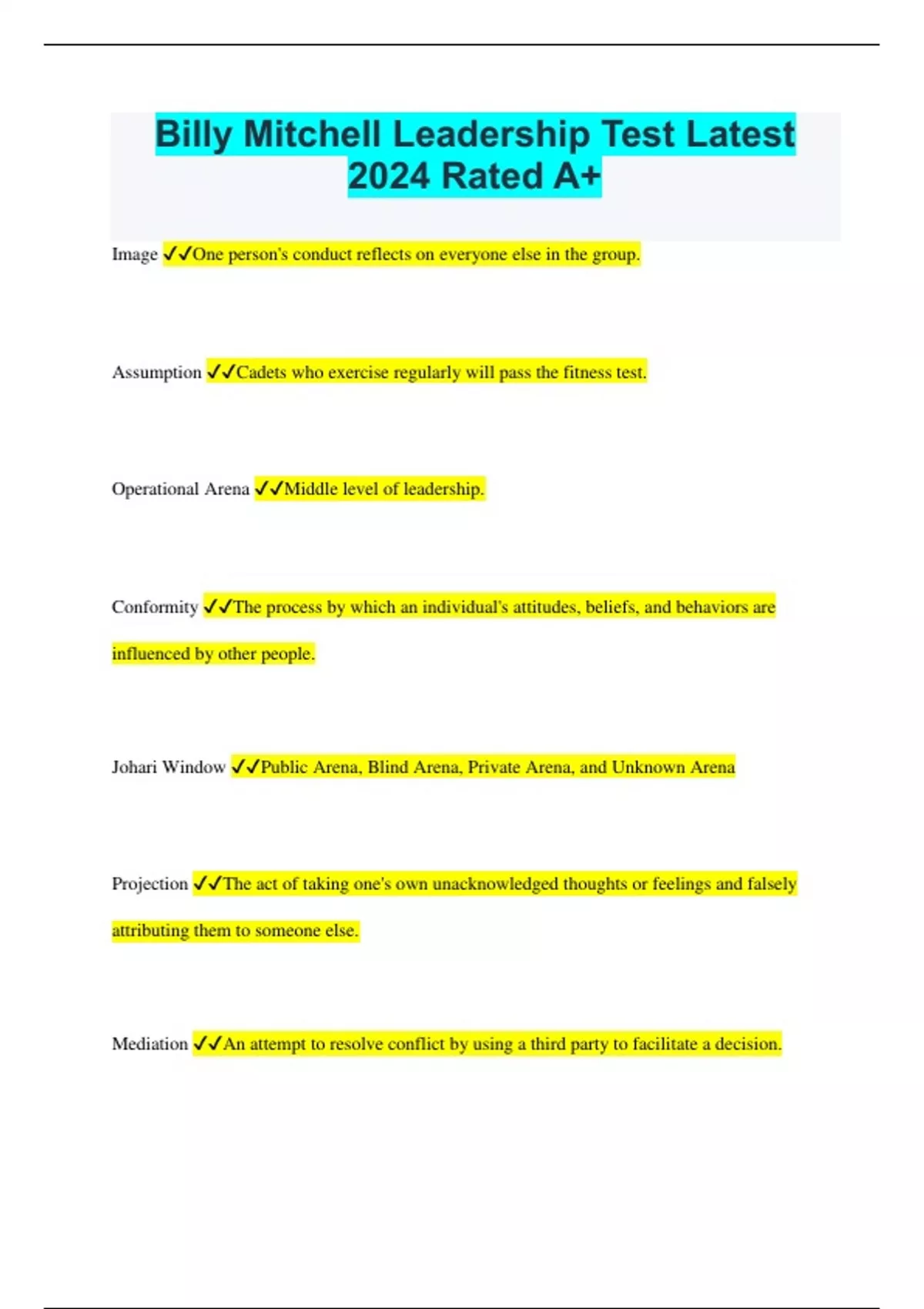 Billy Mitchell Leadership Test Latest 2024 Rated A+ Image One person's conduct reflects on everyone else in the group. Assumption Cadets who exercise regularly will pass the fitness test. Operational Arena Middle level of leadership. Conformity The process by which an individual's attitudes, beliefs, and behaviors are influenced by other people. Johari Window Public Arena, Blind Arena, Private Arena, and Unknown Arena Projection The act of taking one's own unacknowledged thoughts or feelings and falsely attributing them to someone else. Mediation An attempt to resolve conflict by using a third party to facilitate a decision. Expert Power Example A Doctor Mental Models Deeply held internal images of how the world works. Volunteer Service About "selflessness". The difference between "giving" an "taking". Self-Discipline The ability to direct your thoughts, emotions, and actions toward a meaningful purpose. Willpower. The Uniform A vehicle for learning self-discipline, personal responsibility, and self-respect. Teamwork requires... Sacrifice SQ3R Survey, Question, Read, Recall, Review Strategic Arena Highest level of leadership. Branding The process of associating certain visual, cultural, and emotional images with a product. Learning Objective A precise goal. Motivational Self-Statement Simple expressions of belief in oneself. Coercive Power Example Going to the Principal's office. Learning Organizations Places where people are continually learning together. Espoused Theory A line of thought that we claim to believe. Character What does leadership start with? Warriors Defends something valuable - their personal honor. Integrity The willingness to do what is right, even when no one is looking. Excellence in All We Do
