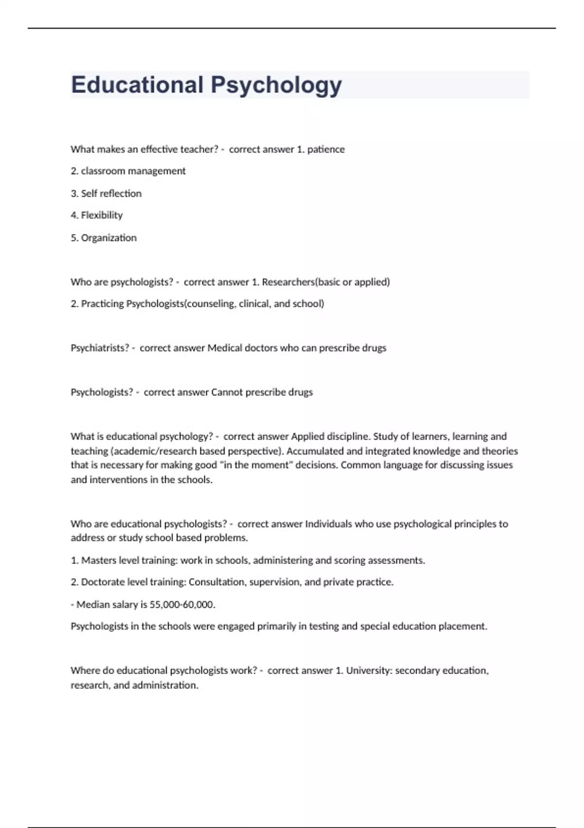 Educational Psychology ESSENTIAL QUESTIONS AND CERTIFIED CORRECT PASSED ANSWERS 2023/2024 What makes an effective teacher? - correct answer 1. patience 2. classroom management 3. Self reflection 4. Flexibility 5. Organization Who are psychologists? - correct answer 1. Researchers(basic or applied) 2. Practicing Psychologists(counseling, clinical, and school) Psychiatrists? - correct answer Medical doctors who can prescribe drugs Psychologists? - correct answer Cannot prescribe drugs What is educational psychology? - correct answer Applied discipline. Study of learners, learning and teaching (academic/research based perspective). Accumulated and integrated knowledge and theories that is necessary for making good "in the moment" decisions. Common language for discussing issues and interventions in the schools. Who are educational psychologists? - correct answer Individuals who use psychological principles to address or study school based problems. 1. Masters level training: work in schools, administering and scoring assessments. 2. Doctorate level training: Consultation, supervision, and private practice. - Median salary is 55,000-60,000. Psychologists in the schools were engaged primarily in testing and special education placement. Where do educational psychologists work? - correct answer 1. University: secondary education, research, and administration. 2. Consultation: private practice, publishing firms, group counseling firms. 3. School systems: assessments, academic and behavioral interventions, crisis interventions. Who do educational psychologists serve? - correct answer 1. Concerned with all students: improve general academics, universal screening, school atmosphere 2. Research and training emphasis on extreme groups: gifted, intellectual disabilities, developmental disabilities, specific learning disorders, behavior disorders. What makes an effective teacher? - correct answer 1. Knowing the material 2. Understanding skills for teaching that material 3. Using an "intentional teaching" model 4. Self-regulating behavior 5. Reflecting and learning from previous experience 6. Applying and integrating all above components 7. Personality components(warmth, compassion)