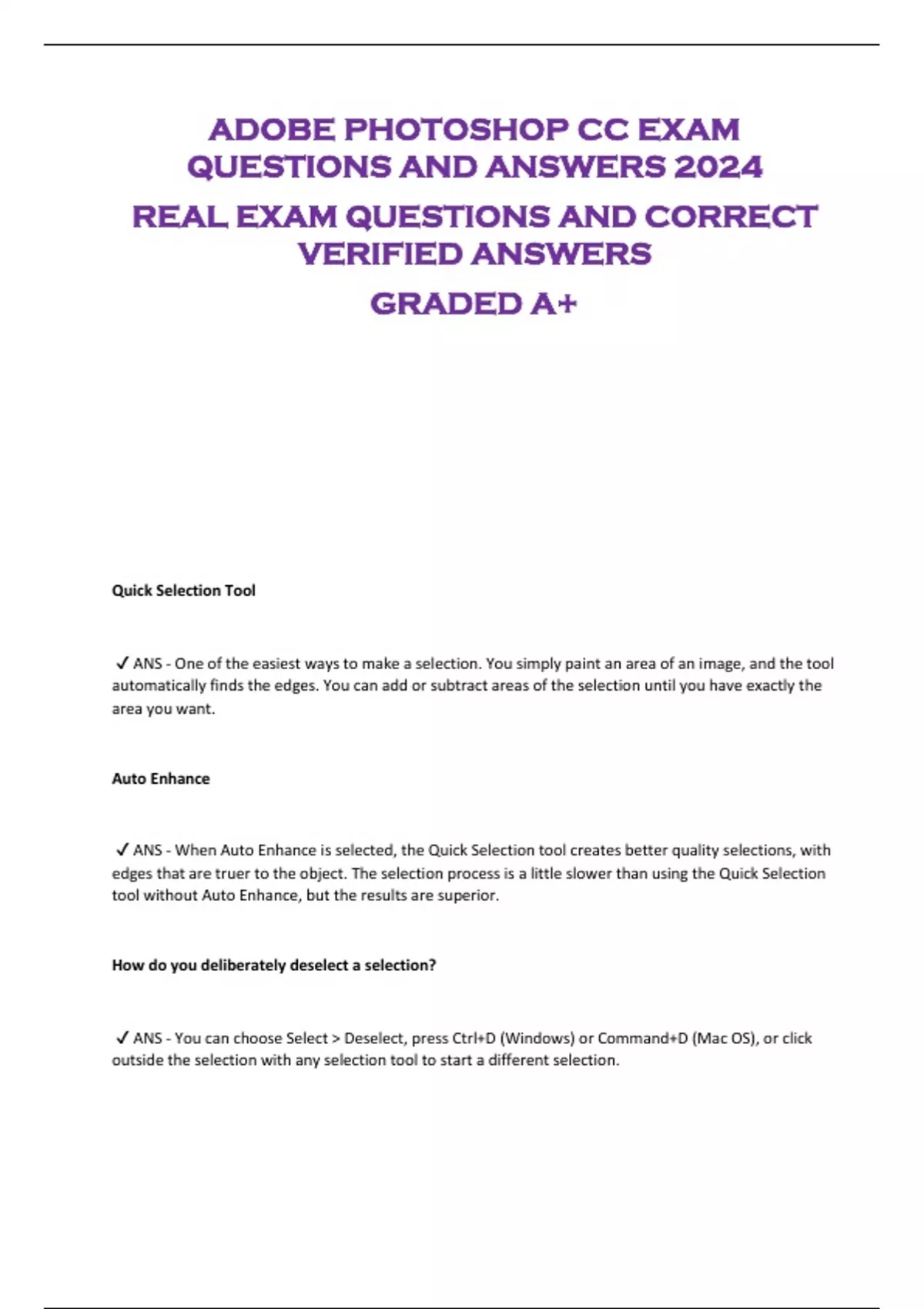 ADOBE PHOTOSHOP CC EXAM QUESTIONS AND ANSWERS 2024 REAL EXAM QUESTIONS AND CORRECT VERIFIED ANSWERS GRADED A+