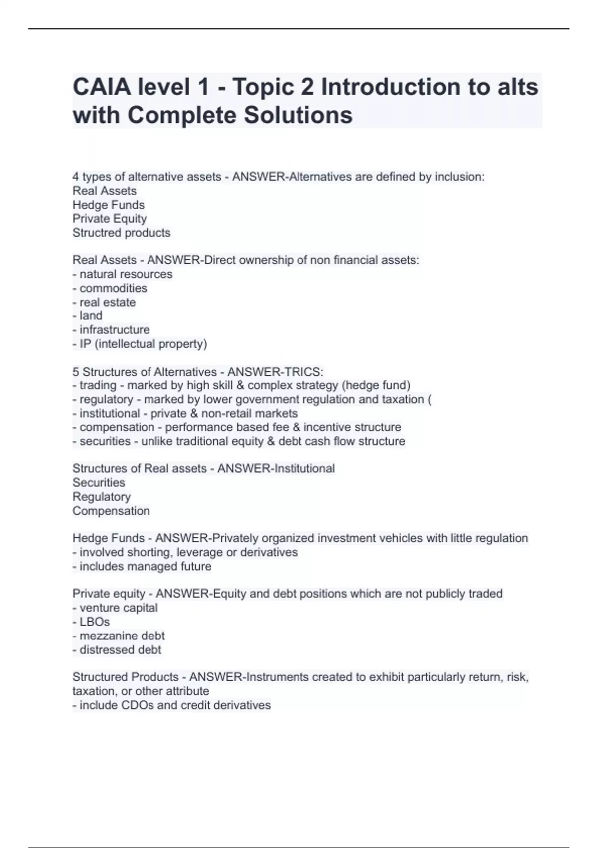 CAIA level 1 - Topic 2 Introduction to alts with Complete Solutions CAIA level 1 - Topic 2 Introduction to alts with Complete Solutions CAIA level 1 - Topic 2 Introduction to alts with Complete Solutions 4 types of alternative assets - ANSWER-Alternatives are defined by inclusion: Real Assets Hedge Funds Private Equity Structred products Real Assets - ANSWER-Direct ownership of non financial assets: - natural resources - commodities - real estate - land - infrastructure - IP (intellectual property) 5 Structures of Alternatives - ANSWER-TRICS: - trading - marked by high skill & complex strategy (hedge fund)