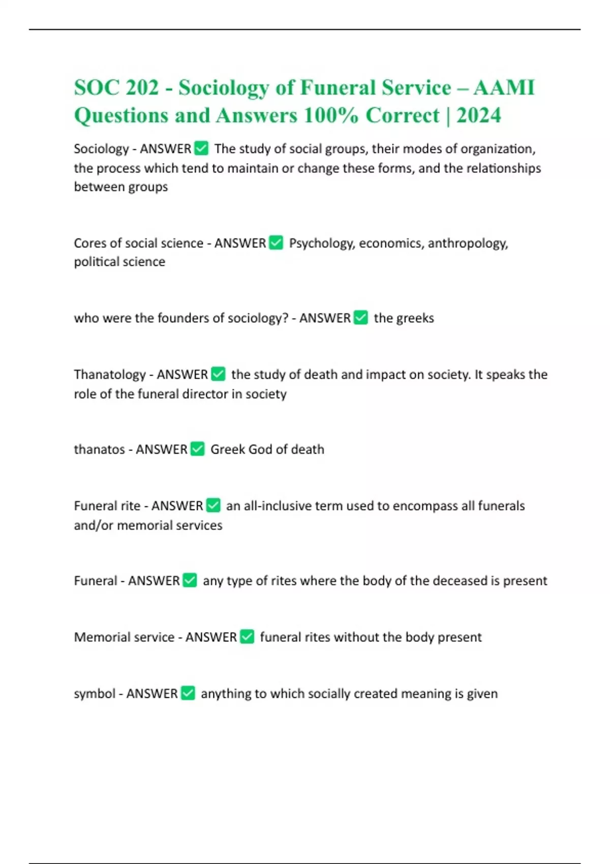 SOC 202 - Sociology of Funeral Service – AAMI Questions and Answers 100% Correct | 2024