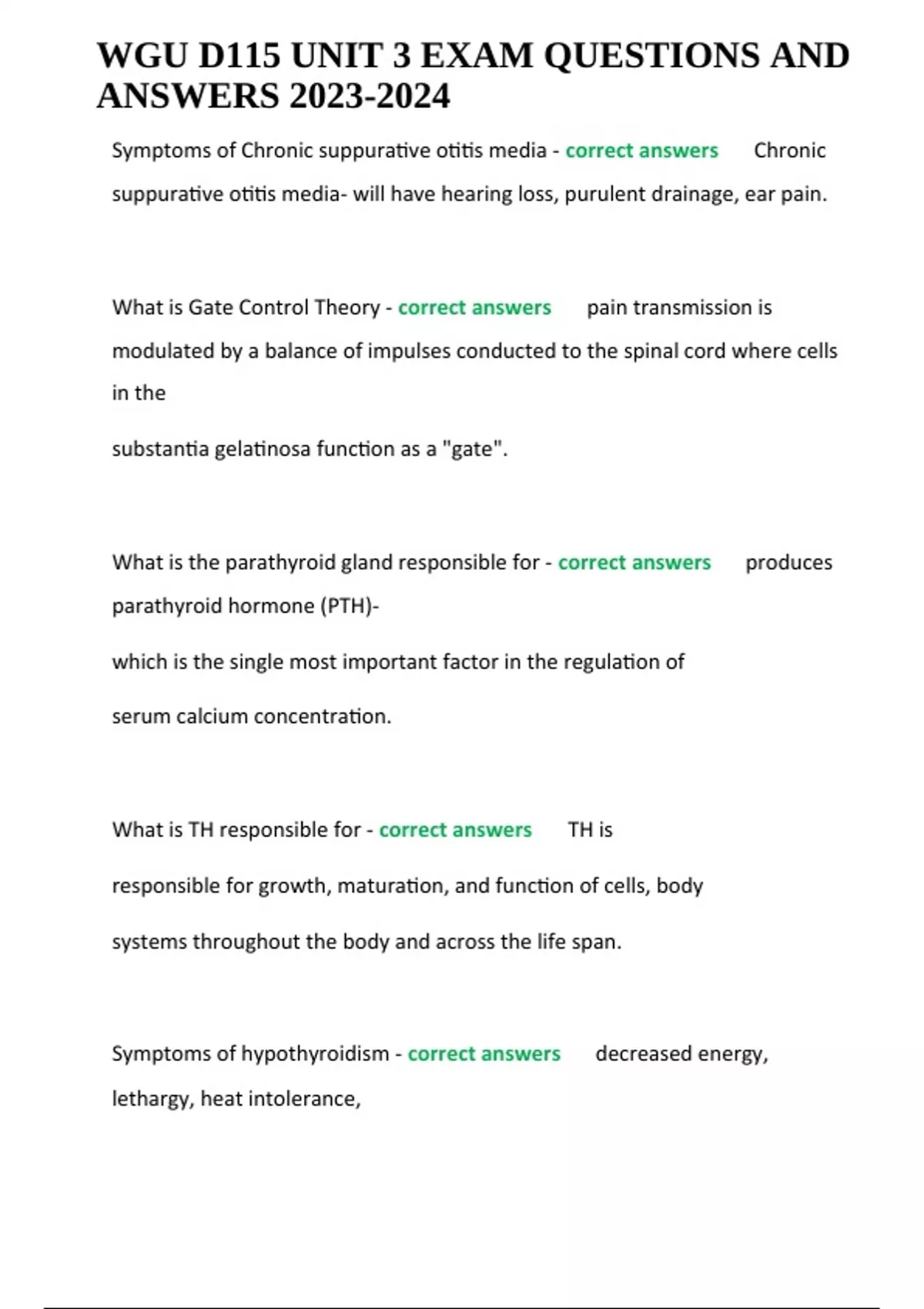Symptoms of Chronic suppurative otitis media - correct answers Chronic suppurative otitis media- will have hearing loss, purulent drainage, ear pain. What is Gate Control Theory - correct answers pain transmission is modulated by a balance of impulses conducted to the spinal cord where cells in the substantia gelatinosa function as a "gate". What is the parathyroid gland responsible for - correct answers produces parathyroid hormone (PTH)- which is the single most important factor in the regulation of serum calcium concentration. What is TH responsible for - correct answers TH is responsible for growth, maturation, and function of cells, body systems throughout the body and across the life span. Symptoms of hypothyroidism - correct answers decreased energy, lethargy, heat intolerance, WGU D115 UNIT 3 EXAM QUESTIONS AND ANSWERS lowered basal temperature, diastolic HTN, MYXEDEMA one of the most important contributors to insulin resistance and DM - correct answers Obesity The definition of legal blindness is the best corrected vision of 20/100. true or false - correct answers FALSE The definition of legal blindness is the best corrected vision of 20/200. A male patient presents with sinus congestion, clear nasal discharge, and a cough that is worse when he is reclined. What is the probable condition causing these symptoms? Peritonsillar abscess Pharyngitis Sinus infection Allergic rhinitis - correct answers Allergic rhinitis is marked by sinus congestion, clear nasal discharge, post nasal drip that causes a sore throat, and cough that is worse when supine. unilateral tonsillar enlargement during acute tonsillitis is suggestive of - correct answers Unilateral tonsillar enlargement during acute tonsillitis is suggestive of a tonsillar abscess. If the patient does not have trouble swallowing, is drooling, or has a muffled voice, then it could be an enlarged tonsil rather than an abscess. Because of the risk of airway obstruction, it is imperative that tonsillar abscess is ruled out during the assessment. Which two statements are true regarding epinephrine? Parasympathetic preganglionic fibers release epinephrine. Epinephrine induces general vasodilation. The action of epinephrine is the same no matter which receptor it binds to. Dopamine is the precursor to epinephrine. Check My Answer - correct answers Dopamine is the precursor of both epinephrine and norepinephrine. Epinephrine induces general vasodilation because of the predominance of βadrenergic receptors in the muscle vasculature. Which structure is specifically involved in pain transmission? Posterior horn Dorsal root ganglia Anterior horn Substantia gelatinosa - correct answers The substantia gelatinosa, which is at the tip of the posterior horn of the spinal cord, is directly involved in pain transmission. Previousquestion