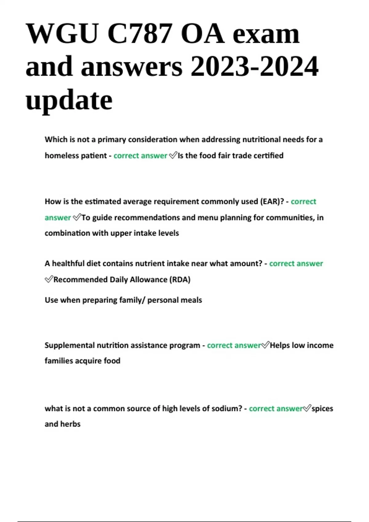 Which is not a primary consideration when addressing nutritional needs for a homeless patient - correct answer Is the food fair trade certified How is the estimated average requirement commonly used (EAR)? - correct answer To guide recommendations and menu planning for communities, in combination with upper intake levels A healthful diet contains nutrient intake near what amount? - correct answer Recommended Daily Allowance (RDA) Use when preparing family/ personal meals Supplemental nutrition assistance program - correct answer Helps low income families acquire food what is not a common source of high levels of sodium? - correct answer spices and herbs WGU C787 OA exam and answers update When nutrition advocates become concerned that recommendations did not do enough to address prevention of chronic illnesses related diet, what policy changes were made? - correct answer RDA's expanded into several DRI categories What is true about Daily Reference Intakes (DRIs)? - correct answer Food labeling must include info about them. They differ depending on age and gender. What is always found on a nutrition label in the US? - correct answer Serving size Which is an appropriate use of AMDR when evaluating the appropriateness of a snack food? - correct answer (AMDR: Acceptable macronutrient dietary range) 50% of calories from fat is too much fat What is meant by Tolerable Upper Intake Level? - correct answer (TUI) The highest level of daily consumption that current data has shown to cause no side effects in humans, ensures people do not take harmful amounts (supplements) What is true of the recommendations, as represented by their setting place graphic? - correct answer Half of the plate should be fruits and vegetables What is a nutritional benefit of fruits and vegetables? - correct answer They provide nutrients that reduce the risk of some types of cancer