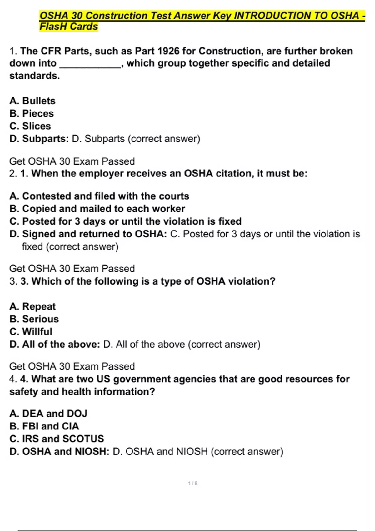 1. The CFR Parts, such as Part 1926 for Construction, are further broken down into ___________, which group together specific and detailed standards. A. Bullets B. Pieces C. Slices D. Subparts: D. Subparts (correct answer) Get OSHA 30 Exam Passed 2. 1. When the employer receives an OSHA citation, it must be: A. Contested and filed with the courts B. Copied and mailed to each worker C. Posted for 3 days or until the violation is fixed D. Signed and returned to OSHA: C. Posted for 3 days or until the violation is fixed (correct answer) Get OSHA 30 Exam Passed 3. 3. Which of the following is a type of OSHA violation? A. Repeat B. Serious C. Willful D. All of the above: D. All of the above (correct answer) Get OSHA 30 Exam Passed 4. 4. What are two US government agencies that are good resources for safety and health information? A. DEA and DOJ B. FBI and CIA C. IRS and SCOTUS D. OSHA and NIOSH: D. OSHA and NIOSH (correct answer) OSHA 30 Construction Test Answer Key INTRODUCTION TO OSHA - FlasH Cards 2 / 8 Get OSHA 30 Exam Passed 5. 5. What section of the OSH Act does the Whistleblower Program reference? A. Section 7(a) B. Section 8 C. Section 11(c) D. Section 21: C. Section 11(c) (correct answer) Get OSHA 30 Exam Passed 6. 6. The creation of OSHA provided this important right to workers: A. The right to equal employment opportunities B. The right to pension benefits C. The right to privacy D. The right to a safe and healthful workplace: D. The right to a safe and healthful workplace (correct answer) Get OSHA 30 Exam Passed 7. 7. When you've been assigned a new job or task, be sure to ask about the: A. Additional pay and benefits B. Time it takes to drive to the nearest OSHA office C. Medical expenses that all you co-workers may have D. Written procedures and any additional training that may be required: D. Written procedures and any additional training that may be required (correct answer) Get OSHA 30 Exam Passed 8. 8. You can request to remain anonymous when OSHA presents a complaint to your employer. A. True B. False: A. True (correct answer) OSHA 30 Construction Test Answer Key INTRODUCTION TO OSHA - FlasH Cards 3 / 8 Get OSHA 30 Exam Passed