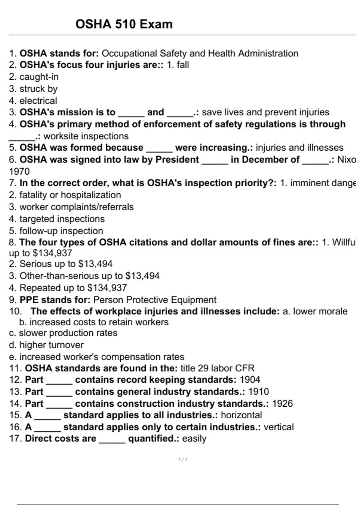 OSHA stands for: Occupational Safety and Health Administration 2. OSHA's focus four injuries are:: 1. fall 2. caught-in 3. struck by 4. electrical 3. OSHA's mission is to _____ and _____.: save lives and prevent injuries 4. OSHA's primary method of enforcement of safety regulations is through _____.: worksite inspections 5. OSHA was formed because _____ were increasing.: injuries and illnesses 6. OSHA was signed into law by President _____ in December of _____.: Nixon; 1970 7. In the correct order, what is OSHA's inspection priority?: 1. imminent danger 2. fatality or hospitalization 3. worker complaints/referrals 4. targeted inspections 5. follow-up inspection 8. The four types of OSHA citations and dollar amounts of fines are:: 1. Willful up to $134,937 2. Serious up to $13,494 3. Other-than-serious up to $13,494 4. Repeated up to $134,937 9. PPE stands for: Person Protective Equipment 10. The effects of workplace injuries and illnesses include: a. lower morale b. increased costs to retain workers c. slower production rates d. higher turnover e. increased worker's compensation rates 11. OSHA standards are found in the: title 29 labor CFR 12. Part _____ contains record keeping standards: 1904 13. Part _____ contains general industry standards.: 1910 14. Part _____ contains construction industry standards.: 1926 15. A _____ standard applies to all industries.: horizontal 16. A _____ standard applies only to certain industries.: vertical 17. Direct costs are _____ quantified.: easily 2 / 7 OSHA 510 Exam 18. Direct costs are usually paid by submitting claims to ______ companies.: insurance 19. An example of a direct cost is: a. medical cost b. physical therapy c. repair costs for damaged equipment d. continuation of pay e. administrative 20. Indirect costs are _____ quantified.: not easily; difficult 21. Indirect costs are usually paid by the _____.: company 22. An example of indirect cost is: a. loss of efficiency by breakup of crew b. lost time by supervisor c. cost of breaking in new worker 23. What is determined by the company's own record of accidents and losses?: Experience Modification Rate 24. EMR equation: ACTUAL losses / EXPECTED losses 25. OSHA defines an excavation as any __ cut, cavity, trench, or depression in the earth's surface formed by earth removal: man-made 26. At trench is defined as a narrow underground excavation that is __ than it is wide: deeper 27. A trench cannot be wider than: 15 feet 28. Cave-in protection is required for all excavations greater than: 5 feet in depth unless they are entirely in sold stable rock 29. A ladder must be provided every: 25 feet for excavations greater than 4 feet in depth 30. Spoil piles, material and equipment must be kept: 2 feet from the excavation 31. Excavation inspections must be conducted: DAILY and before start of work 32. Excavation inspections must be conducted to determine: soil classification 33. For all trenches deeper than 5 feet, OSHA requires what to protecworkers from cave-in?: a. sloping b. shoring c. benching d. shielding 34. Stable rock: natural solid mineral material than can be excavated with vertical sides 35. Type A: cohesive soils with an unconfined compressive strength of __ tons per square foot: 1.5 tons