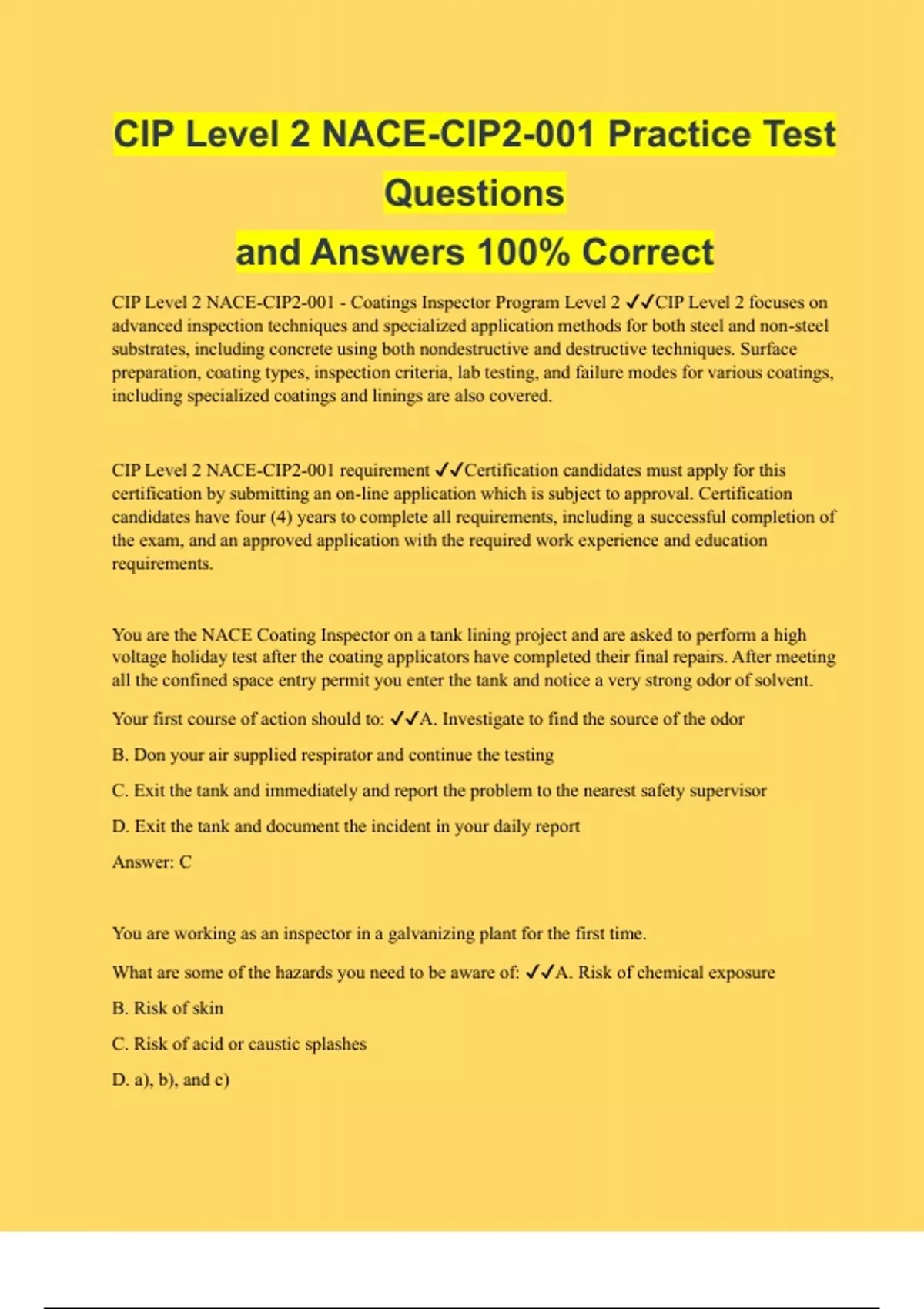 CIP Level 2 NACE-CIP2-001 - Coatings Inspector Program Level 2 CIP Level 2 focuses on advanced inspection techniques and specialized application methods for both steel and non-steel substrates, including concrete using both nondestructive and destructive techniques. Surface preparation, coating types, inspection criteria, lab testing, and failure modes for various coatings, including specialized coatings and linings are also covered. CIP Level 2 NACE-CIP2-001 requirement Certification candidates must apply for this certification by submitting an on-line application which is subject to approval. Certification candidates have four (4) years to complete all requirements, including a successful completion of the exam, and an approved application with the required work experience and education requirements. You are the NACE Coating Inspector on a tank lining project and are asked to perform a high voltage holiday test after the coating applicators have completed their final repairs. After meeting all the confined space entry permit you enter the tank and notice a very strong odor of solvent. Your first course of action should to: A. Investigate to find the source of the odor B. Don your air supplied respirator and continue the testing C. Exit the tank and immediately and report the problem to the nearest safety supervisor D. Exit the tank and document the incident in your daily report Answer: C You are working as an inspector in a galvanizing plant for the first time. What are some of the hazards you need to be aware of: A. Risk of chemical exposure B. Risk of skin C. Risk of acid or