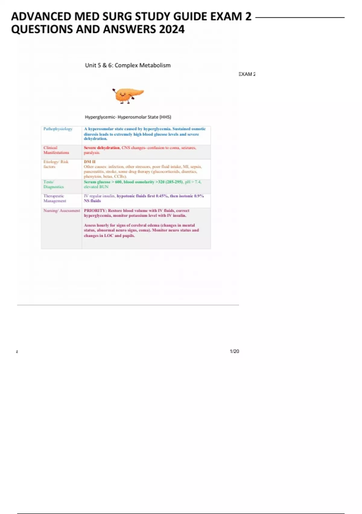 Hyperglycemic- Hyperosmolar State (HHS) Pathophysiology A hyperosmolar state caused by hyperglycemia. Sustained osmotic diuresis leads to extremely high blood glucose levels and severe dehydration. Clinical Manifestations Severe dehydration, CNS changes- confusion to coma, seizures, paralysis. Etiology/ Risk factors DM II Other causes: infection, other stressors, poor fluid intake, MI, sepsis, pancreatitis, stroke, some drug therapy (glucocorticoids, diuretics, phenytoin, betas, CCBs). Tests/ Diagnostics Serum glucose > 600, blood osmolarity >320 (285-295), pH > 7.4, elevated BUN Therapeutic Management IV regular insulin, hypotonic fluids first 0.45%, then isotonic 0.9% NS fluids Nursing/ Assessment PRIORITY: Restore blood volume with IV fluids, correct hyperglycemia, monitor potassium level with IV insulin. Assess hourly for signs of cerebral edema (changes in mental status, abnormal neuro signs, coma). Monitor neuro status and changes in LOC and pupils. 11/22/23, 7:15 PM EXAM 2 Study Guide about:blank 2/20 Diabetic Ketoacidosis (DKA) Pathophysiology Complication of diabetes characterized by uncontrolled hyperglycemia, metabolic acidosis, and increased production of ketones. Insulin deficiency and an increase in hormone release leads to increased liver and kidney glucose production. Clinical Manifestations Polyuria, polydipsia, polyphagia, fruity breath, vomiting, abd pain, kussmaul respirations, dehydration, weakness, confusion, shock, coma. Etiology/ Risk factors DM I Other causes: Infection, other stressors, inadequate insulin dose. Tests/ Diagnostics Serum glucose >300, ketones in urine, hyperkalemia > 5 (causes ST elevation on EKG), low pH < 7.35, low HCO3 < 22 Low lab values: calcium < 9, sodium < 135, mag < 1.5, phos < 2, pH < 7.35, HCO3 < 22, Therapeutic Management IV regular insulin, isotonic IV fluid NS 0.9% Nursing/ Assessment PRIORITY: Restore blood volume with fluids, correct hyperglycemia, monitor K level with IV insulin- risk for hypokalemia!! Sxs fatigue, malaise, confusions, muscle weakness, shallow respirations, abdominal distention, paralytic ileus, hypotension, weak pulse. EKG will show ST depression or U wave. Hypokalemia is a common cause of death in the treatment of DKA. Assess airway, level on consciousness, hydration status, electrolytes, and BG. Dehydration: decreased skin turgor, low CVP, cool, clammy skin, weak/ rapid pulse, hypotension. Ensure UOP > 30 mL/hr before giving IV K. Assess cardiac, kidney, and mental status to avoid FVO. Monitor for sxs of HF and pulmonary edema, BP, strict I&Os, daily weights. Teach pts and family to check blood sugar levels Q4H- Q6H when > 250 and check for ketones > 300. Sick day rules: Call HCP when ill, monitor blood sugar Q4H, check urine for ketones, continue to take insulin, drink 8-12 oz QH when awake, continue scheduled meals, rest. Contact HCP if persistent n/v, fever of 101.5 F longer than 24 hr, elevated blood sugar after 2 doses of insulin, and ketones in urine. 11/22/23, 7:15 PM EXAM 2 Study Guide about:blank 3/20 Hypothyroidism Pathophysiology The thyroid fails to secrete sufficient levels of thyroid hormones, T3 and T4. This results in whole-body decreased metabolism from inadequate cellular regulation. Low metabolism causes the hypothalamus and anterior pituitary gland to make TSH in an attempt to trigger thyroid hormone release. Clinical Manifestations Slow metabolism, lethargy, goiter, generalized weakness, anorexia, muscle aches, paresthesia, constipation, cold intolerance, decreased libido, heavy periods or amenorrhea, impotence, infertility. Complication: Myxedema coma- caused by a decreased cardiac output and gas exchange in the brain and other organs. Slowed metabolism worsens. Pt presents with course features, periorbital and facial edema, blank expression, thick tongue. Medical emergency!! Sxs hypercalcemia- bone pain, wide QRS complex (place on tele!!) Etiology/ Risk factors Autoimmune (Hashimoto thyroiditis) surgical or radiation induced thyroid destruction, congenital/ poor thyroid development, cancer, not ingesting enough iodine and tyrosine. Tests/ Diagnostics Low T3 and T4, high serum calcium, high TSH Therapeutic Management Levothyroxine (Synthroid) Warm environment for hypothermia. Nursing/ Assessment PRIORITY: Airway and breathing are 1 priority for myxedema st coma. Monitor for decreased perfusion r/t decreased HR. Teach pts and family that this is lifelong drug therapy. Take Synthroid first thing in the morning on empty stomach, encourage fiber, stool softener to prevent constipation, well-balanced diet with adequate fiber and fluid intake. Teach to monitor for hyperthyroidism with Rx therapy