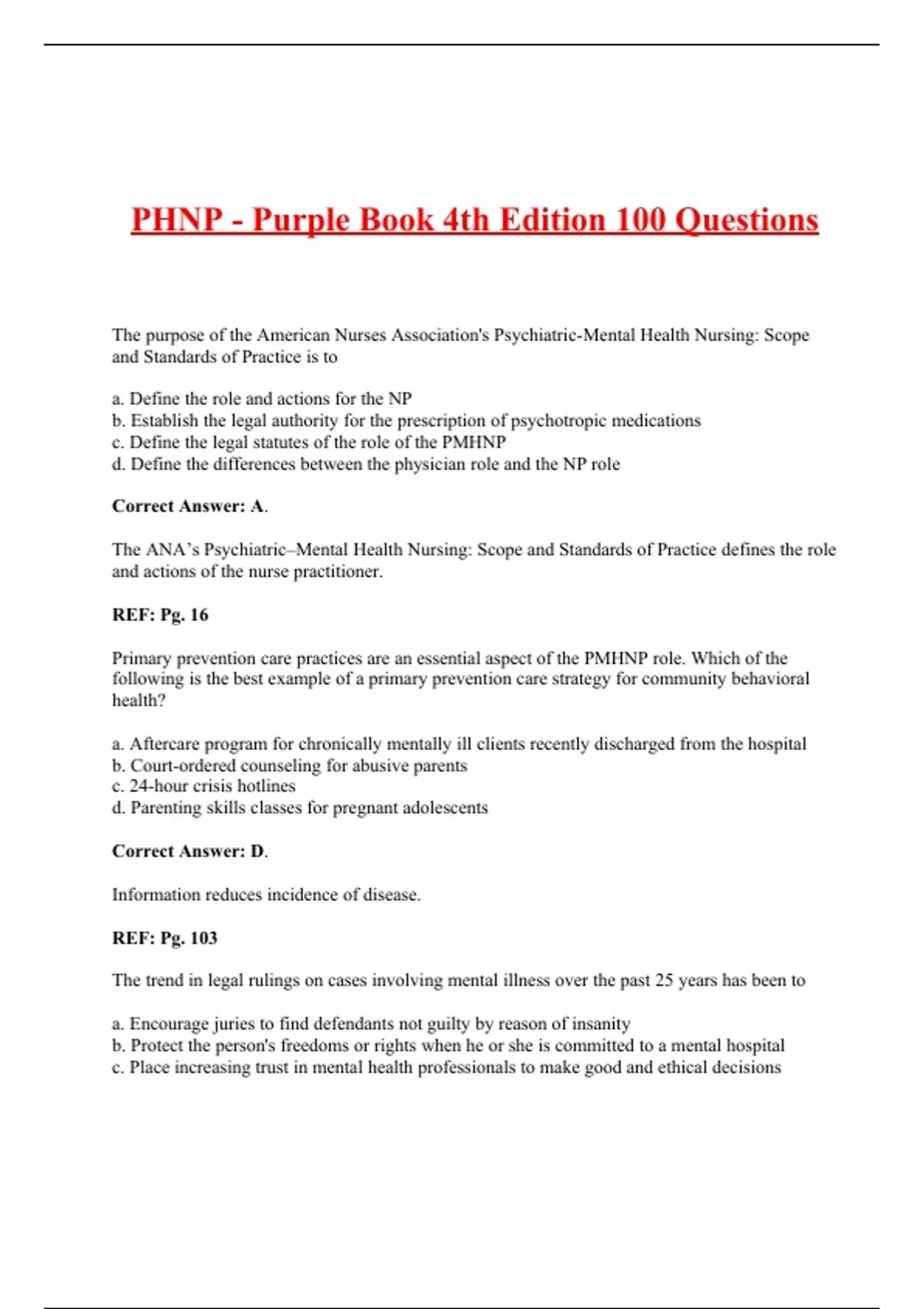 PHNP - Purple Book 4th Edition 100 Questions The purpose of the American Nurses Association's Psychiatric-Mental Health Nursing: Scope and Standards of Practice is to a. Define the role and actions for the NP b. Establish the legal authority for the prescription of psychotropic medications c. Define the legal statutes of the role of the PMHNP d. Define the differences between the physician role and the NP role Correct Answer: A. The ANA’s Psychiatric–Mental Health Nursing: Scope and Standards of Practice defines the role and actions of the nurse practitioner. REF: Pg. 16 Primary prevention care practices are an essential aspect of the PMHNP role. Which of the following is the best example of a primary prevention care strategy for community behavioral health? a. Aftercare program for chronically mentally ill clients recently discharged from the hospital b. Court-ordered counseling for abusive parents c. 24-hour crisis hotlines d. Parenting skills classes for pregnant adolescents Correct Answer: D. Information reduces incidence of disease. REF: Pg. 103 The trend in legal rulings on cases involving mental illness over the past 25 years has been to a. Encourage juries to find defendants not guilty by reason of insanity b. Protect the person's freedoms or rights when he or she is committed to a mental hospital c. Place increasing trust in mental health professionals to make good and ethical decisions d. Decrease the "red tape" associated with commitments so that commitments are faster and easier Correct Answer: B. Identifies the trend of ensuring the protection of individual civil liberties for psychiatric clients. REF: Pg. 20, 21 Mr. Smithers, an involuntarily hospitalized patient experiencing psychotic symptoms, refuses to take any of his ordered medication because he believes "Jesus Christ told me I am the prophet and must fast for a year." Your actions should be based on your knowledge of which of the following? a. Psychiatric clients cannot refuse treatment b. Psychiatric clients do not always know what is good for them c. Psychiatric clients can refuse treatment d. Psychiatric clients cannot be trusted to make good healthcare decisions and, therefore, the nurse's best clinical judgment should guide actions Correct Answer: C. As with any client, psychiatric clients can refuse treatment un-less a legal process resulting in involuntary commitment or mandatory court order for treatment has been obtained. REF: Pg. 19, 31 Which of the following statements best reflects the difference between the nurse-client (N-C) relationship and a social relationship? a. In the N-C relationship, the primary focus is on the client and the client's needs. b. Goals in the N-C relationship are deliberately left vague and unspoken so that the client can work on any issue. c. In the N-C relationship, the nurse is solely responsible for making the relationship work. d. In the N-C relationship, there is no place for social interaction. Correct Answer: A. Social relationships are mutual interpersonal relationships in which the needs of both parties are addressed. The N–C relationship is most concerned with meeting the needs of the client. REF: Pg. 38 A community has an unusually high incidence of depression and drug use among the teen-age population. The public health nurses decide to address this problem, in part, by modifying the environment and strengthening the capacities of families to prevent the development of new cases of depression and drug use. What is this is an example of? a. Primary prevention b. Secondary prevention c. Tertiary prevention d. Protective factorial prevention Correct Answer: A. This action focuses on interventions designed to reduce the incidence of new cases of disease REF: Pg. 103 Mrs. Kemp is voluntarily admitted to the hospital. After 24 hours, she states she wishes to leave because "this place can't help me." The best nursing action that reflects the legal right of this client is a. Discharge the client b. Explain that the client cannot leave until you can complete further assessment c. Allow the client to leave but have her sign forms stating she is leaving against medical advice d. Immediately start the paperwork to commit the client and to allow you to treat her against her wishes Correct Answer: B. Almost every state allows for a brief period of detainment to assess a client for dangerousness to self or others before allowing the client to leave a hospital setting, even if the admission was voluntary. REF: Pg. 21 In forming a therapeutic relationship with clients, the PMHNP must consider developing many characteristics that are known to be helpful in relationship-building. Which of the following is an essential part of building a therapeutic relationship? a. Collecting a family history b. Like-mindedness c. Authenticity d. Accuracy in assessment Correct Answer: C. Authenticity. Being genuine, honest, and respectful are essential elements in establishing a working relationship with any client. Like-mindedness is not a part of the therapeutic relationship. Although an important aspect of the PMHNP role, collecting a family history and accuracy in assessment does not in and of itself facilitate relationship-building. REF: Pg. 38 According to the DSM-5, which of the following is true? (Ch. 3) a. A mental disorder is equivalent to the need for treatment. b. Diagnostic criteria are used to inform clinical judgment. c. Socially deviant behavior is considered a mental disorder. d. A culturally expected response to a stressor is not a mental disorder.