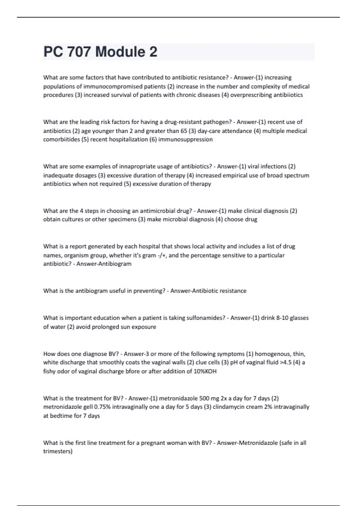 What are some factors that have contributed to antibiotic resistance? - Answer-(1) increasing populations of immunocompromised patients (2) increase in the number and complexity of medical procedures (3) increased survival of patients with chronic diseases (4) overprescribing antibiiotics What are the leading risk factors for having a drug-resistant pathogen? - Answer-(1) recent use of antibiotics (2) age younger than 2 and greater than 65 (3) day-care attendance (4) multiple medical comorbiitides (5) recent hospitalization (6) immunosuppression What are some examples of innapropriate usage of antibiotics? - Answer-(1) viral infections (2) inadequate dosages (3) excessive duration of therapy (4) increased empirical use of broad spectrum antibiotics when not required (5) excessive duration of therapy What are the 4 steps in choosing an antimicrobial drug? - Answer-(1) make clinical diagnosis (2) obtain cultures or other specimens (3) make microbial diagnosis (4) choose drug What is a report generated by each hospital that shows local activity and includes a list of drug names, organism group, whether it's gram -/+, and the percentage sensitive to a particular antibiotic? - Answer-Antibiogram What is the antibiogram useful in preventing? - Answer-Antibiotic resistance What is important education when a patient is taking sulfonamides? - Answer-(1) drink 8-10 glasses of water (2) avoid prolonged sun exposure How does one diagnose BV? - Answer-3 or more of the following symptoms (1) homogenous, thin, white discharge that smoothly coats the vaginal walls (2) clue cells (3) pH of vaginal fluid >4.5 (4) a fishy odor of vaginal discharge bfore or after addition of 10%KOH What is the treatment for BV? - Answer-(1) metronidazole 500 mg 2x a day for 7 days (2) metronidazole gell 0.75% intravaginally one a day for 5 days (3) clindamycin cream 2% intravaginally at bedtime for 7 days What is the first line treatment for a pregnant woman with BV? - Answer-Metronidazole (safe in all trimesters)What should your patient avoid when taking metronidazole? - Answer-Alcohol and alcohol containing products What is considered the safest medication administration for a breastfeeding mother with BV? - Answer-Metrogel Is there a bacterial diagnostic for BV? - Answer-no Why are mycobacterial infection (like TB) among the most difficult to cure? - Answer-(1) grow slowly and are relatively resistant to drugs that are largely dependent on how rapidly cells are dividing (2) have a lipid rich cell wall relatively impermeable to many drugs (3) are usually intracellular and inaccessible to drugs that do not have a good intracellular penetration (4) have the ability to go into a dormant state (5) easily develop resistant to any single drug What is a ring of the chemical structure of certain antibiotics including penicillins, cephalosporings, and related compounds? - Answer-Beta-lactam