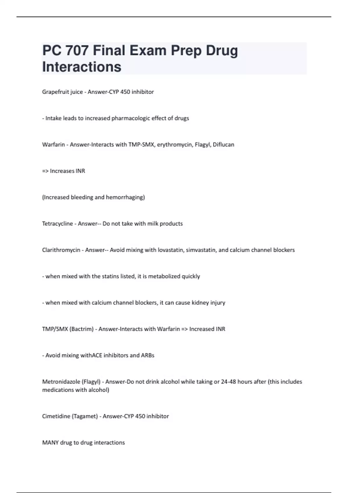 Grapefruit juice - Answer-CYP 450 inhibitor - Intake leads to increased pharmacologic effect of drugs Warfarin - Answer-Interacts with TMP-SMX, erythromycin, Flagyl, Diflucan => Increases INR (Increased bleeding and hemorrhaging) Tetracycline - Answer-- Do not take with milk products Clarithromycin - Answer-- Avoid mixing with lovastatin, simvastatin, and calcium channel blockers - when mixed with the statins listed, it is metabolized quickly - when mixed with calcium channel blockers, it can cause kidney injury TMP/SMX (Bactrim) - Answer-Interacts with Warfarin => Increased INR - Avoid mixing withACE inhibitors and ARBs Metronidazole (Flagyl) - Answer-Do not drink alcohol while taking or 24-48 hours after (this includes medications with alcohol) Cimetidine (Tagamet) - Answer-CYP 450 inhibitor MANY drug to drug interactions- Warfarin - Calcium Channel blockers - Metronidazole ACE inhibitors - Answer-Must be stopped before switching to an ARNI (36-48 hours) due to the risk of angioedema that can occur when these meds are combined with ARNIs - do not combine with ARBs