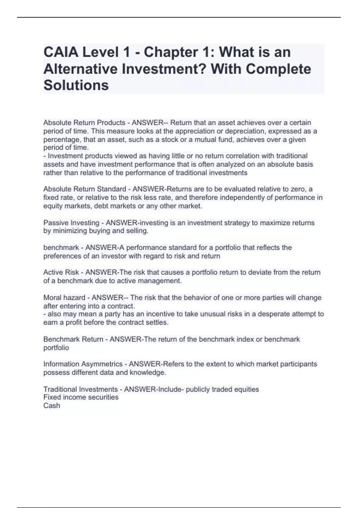 CAIA Level 1 - Chapter 1: What is an Alternative Investment? With Complete SolutionsCAIA Level 1 - Chapter 1: What is an Alternative Investment? With Complete SolutionsCAIA Level 1 - Chapter 1: What is an Alternative Investment? With Complete Solutions Absolute Return Products - ANSWER-- Return that an asset achieves over a certain period of time. This measure looks at the appreciation or depreciation, expressed as a percentage, that an asset, such as a stock or a mutual fund, achieves over a given period of time. - Investment products viewed as having little or no return correlation with traditional assets and have investment performance that is often analyzed on an absolute basis rather than relative to the performance of traditional investments Absolute Return Standard - ANSWER-Returns are to be evaluated relative to zero, a fixed rate, or relative to the risk less rate, and therefore independently of performance in equity markets, debt markets or any other market. Passive Investing - ANSWER-investing is an investment strategy to maximize returns by minimizing buying and selling. benchmark - ANSWER-A performance standard for a portfolio that reflects the preferences of an investor with regard to risk and return Active Risk - ANSWER-The risk that causes a portfolio return to deviate from the return of a benchmark due to active management.