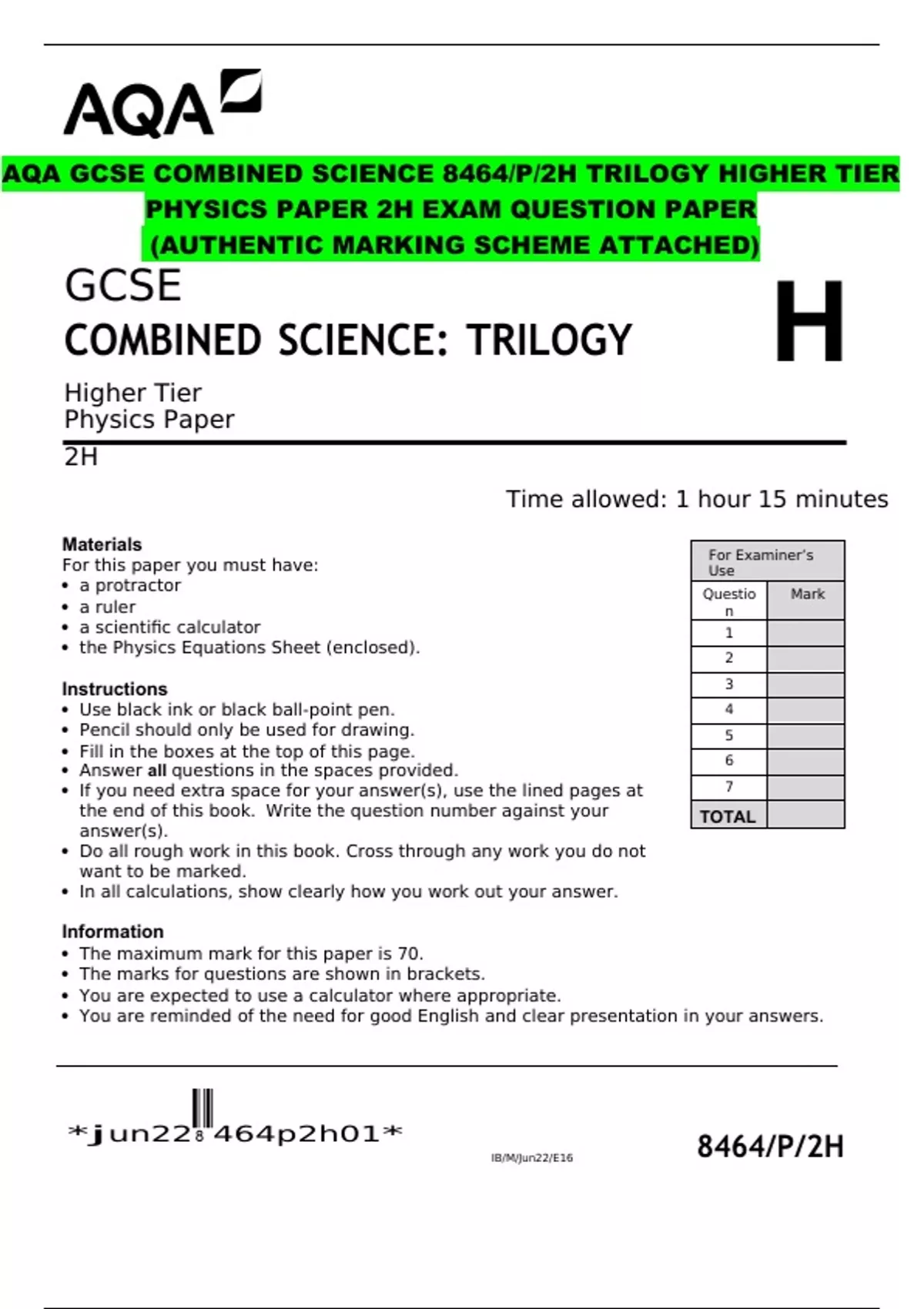 AQA GCSE COMBINED SCIENCE 8464/P/2H TRILOGY HIGHER TIER PHYSICS PAPER 2H EXAM QUESTION PAPER (AUTHENTIC MARKING SCHEME ATTACHED)