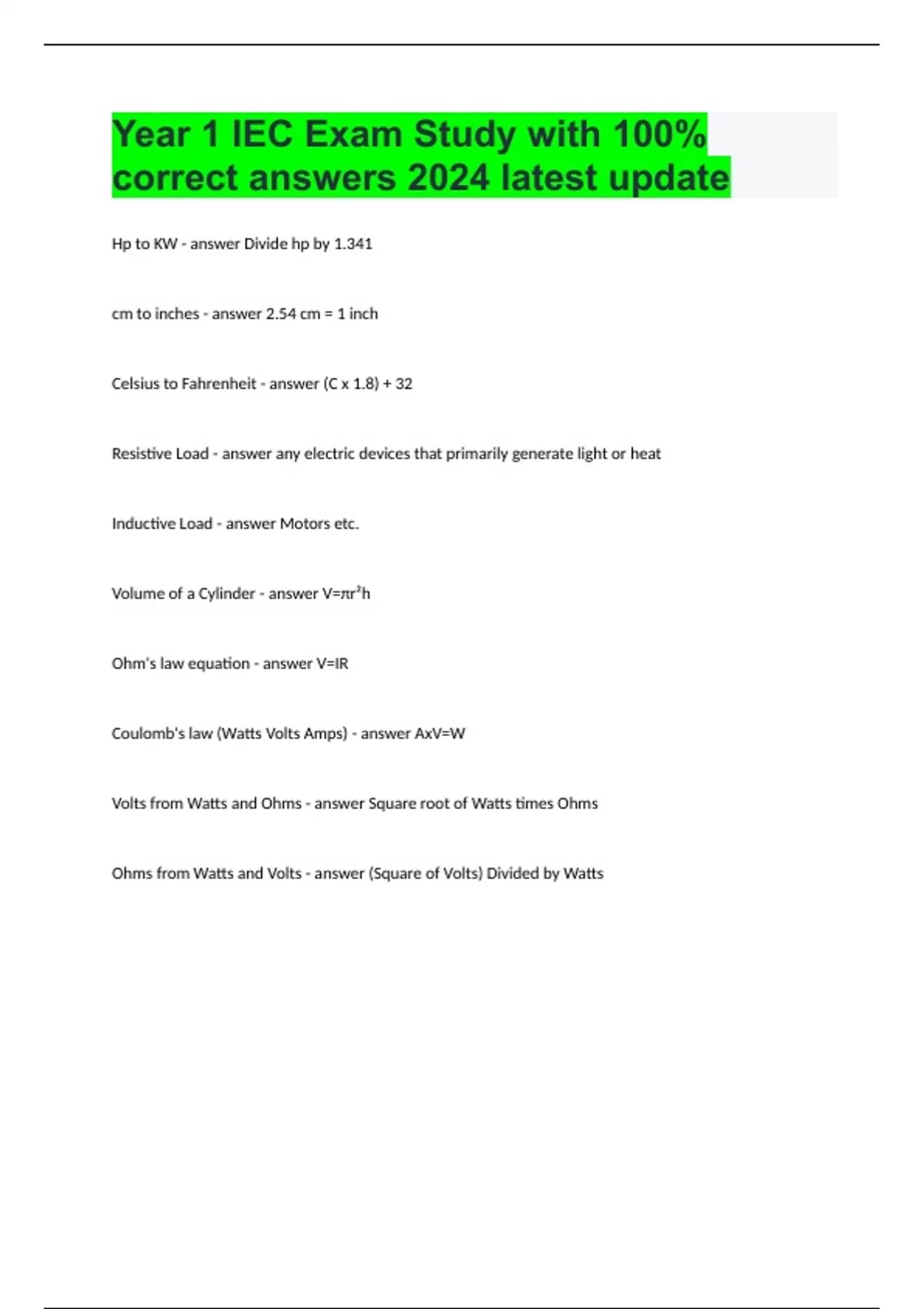 Hp to KW Divide hp by 1.341 cm to inches 2.54 cm = 1 inch Brainpower Read More Previous Play Next Rewind 10 seconds Move forward 10 seconds Unmute 0:07 / 0:15 Full screen Celsius to Fahrenheit (C x 1.8) + 32 Resistive Load any electric devices that primarily generate light or heat Inductive Load Motors etc. Volume of a Cylinder V=πr²h Ohm's law equation V=IR Coulomb's law (Watts Volts Amps) AxV=W Volts from Watts and Ohms Square root of Watts times Ohms Ohms from Watts and Volts (Square of Volts) Divided by Watts