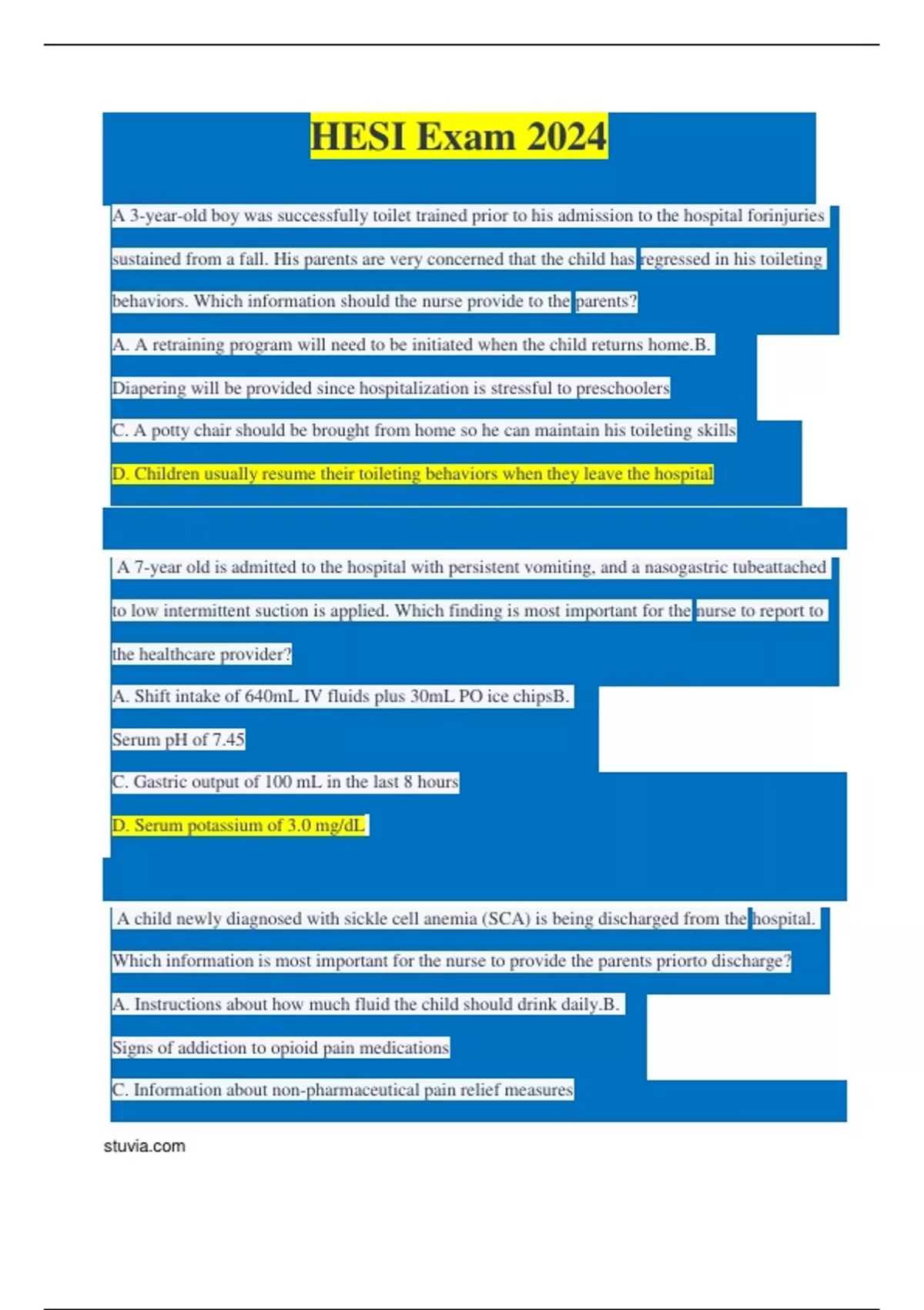 A 7-year old is admitted to the hospital with persistent vomiting, and a nasogastric tube attached to low intermittent suction is applied. Which finding is most important for the nurse to report to the healthcare provider? A. Shift intake of 640mL IV fluids plus 30mL PO ice chips B. Serum pH of 7.45 C. Gastric output of 100 mL in the last 8 hours D. Serum potassium of 3.0 mg/dL A child newly diagnosed with sickle cell anemia (SCA) is being discharged from the hospital. Which information is most important for the nurse to provide the parents prior to discharge? A. Instructions about how much fluid the child should drink daily. B. Signs of addiction to opioid pain medications C. Information about non-pharmaceutical pain relief measures
