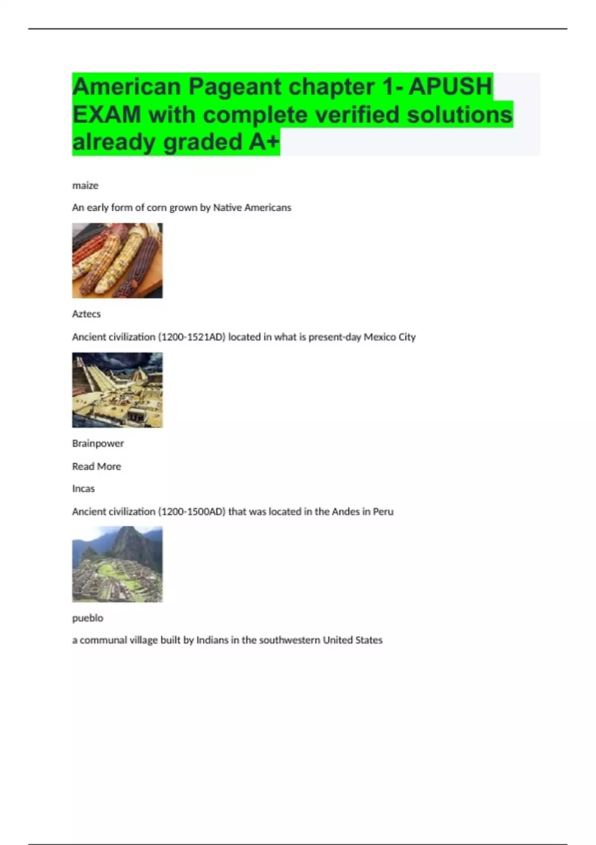 American Pageant chapter 1- APUSH EXAM with complete verified solutions already graded A+