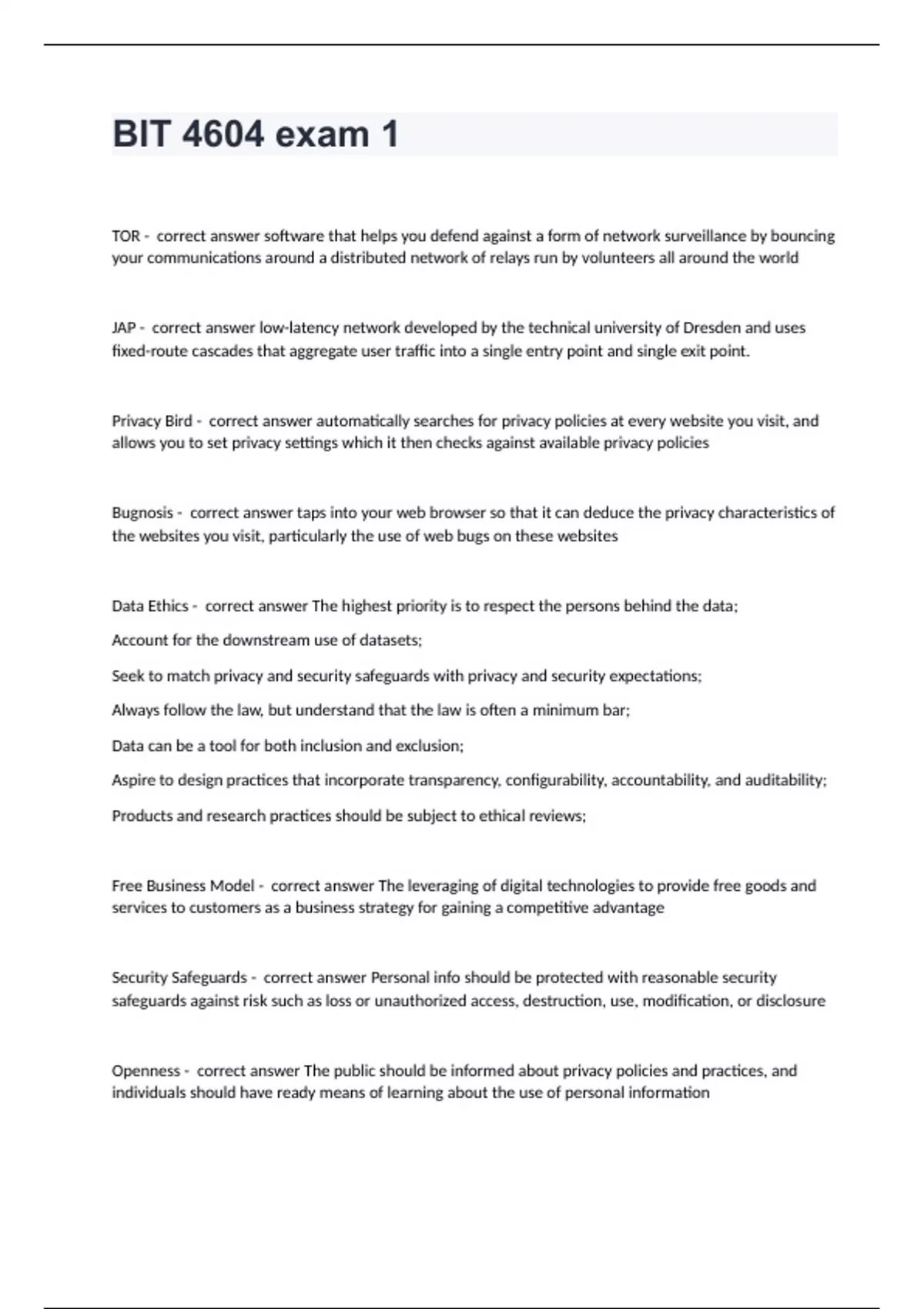 BIT 4604 exam 1TOR - correct answer software that helps you defend against a form of network surveillance by bouncing your communications around a distributed network of relays run by volunteers all around the world JAP - correct answer low-latency network developed by the technical university of Dresden and uses fixed-route cascades that aggregate user traffic into a single entry point and single exit point. Privacy Bird - correct answer automatically searches for privacy policies at every website you visit, and allows you to set privacy settings which it then checks against available privacy policies Bugnosis - correct answer taps into your web browser so that it can deduce the privacy characteristics of the websites you visit, particularly the use of web bugs on these websites Data Ethics - correct answer The highest priority is to respect the persons behind the data; Account for the downstream use of datasets; Seek to match privacy and security safeguards with privacy and security expectations; Always follow the law, but understand that the law is often a minimum bar; Data can be a tool for both inclusion and exclusion; Aspire to design practices that incorporate transparency, configurability, accountability, and auditability; Products and research practices should be subject to ethical reviews; Free Business Model - correct answer The leveraging of digital technologies to provide free goods and services to customers as a business strategy for gaining a competitive advantage Security Safeguards - correct answer Personal info should be protected with reasonable security safeguards against risk such as loss or unauthorized access, destruction, use, modification, or disclosure Openness - correct answer The public should be informed about privacy policies and practices, and individuals should have ready means of learning about the use of personal information