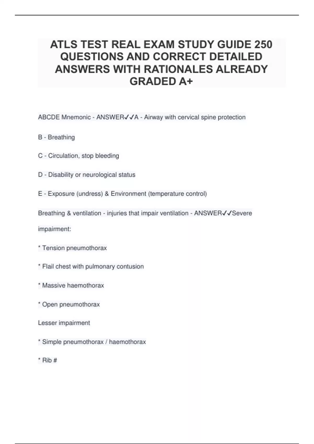 ATLS TEST REAL EXAM STUDY GUIDE 250 QUESTIONS AND CORRECT DETAILED ANSWERS WITH RATIONALES ALREADY GRADED A+