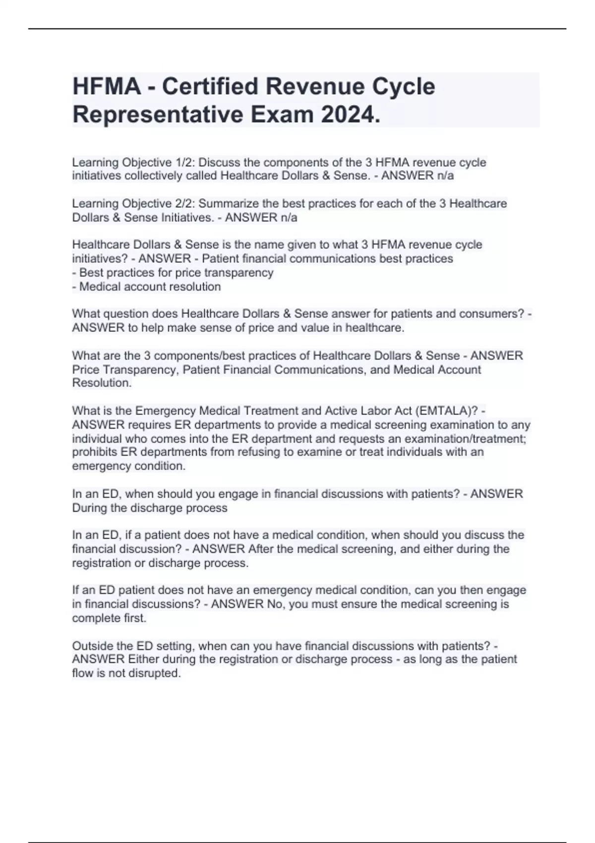 HFMA - Certified Revenue Cycle Representative Exam 2024. Learning Objective 1/2: Discuss the components of the 3 HFMA revenue cycle initiatives collectively called Healthcare Dollars & Sense. - ANSWER n/a Learning Objective 2/2: Summarize the best practices for each of the 3 Healthcare Dollars & Sense Initiatives. - ANSWER n/a Healthcare Dollars & Sense is the name given to what 3 HFMA revenue cycle initiatives? - ANSWER - Patient financial communications best practices - Best practices for price transparency - Medical account resolution What question does Healthcare Dollars & Sense answer for patients and consumers? - ANSWER to help make sense of price and value in healthcare. What are the 3 components/best practices of Healthcare Dollars & Sense - ANSWER Price Transparency, Patient Financial Communications, and Medical Account