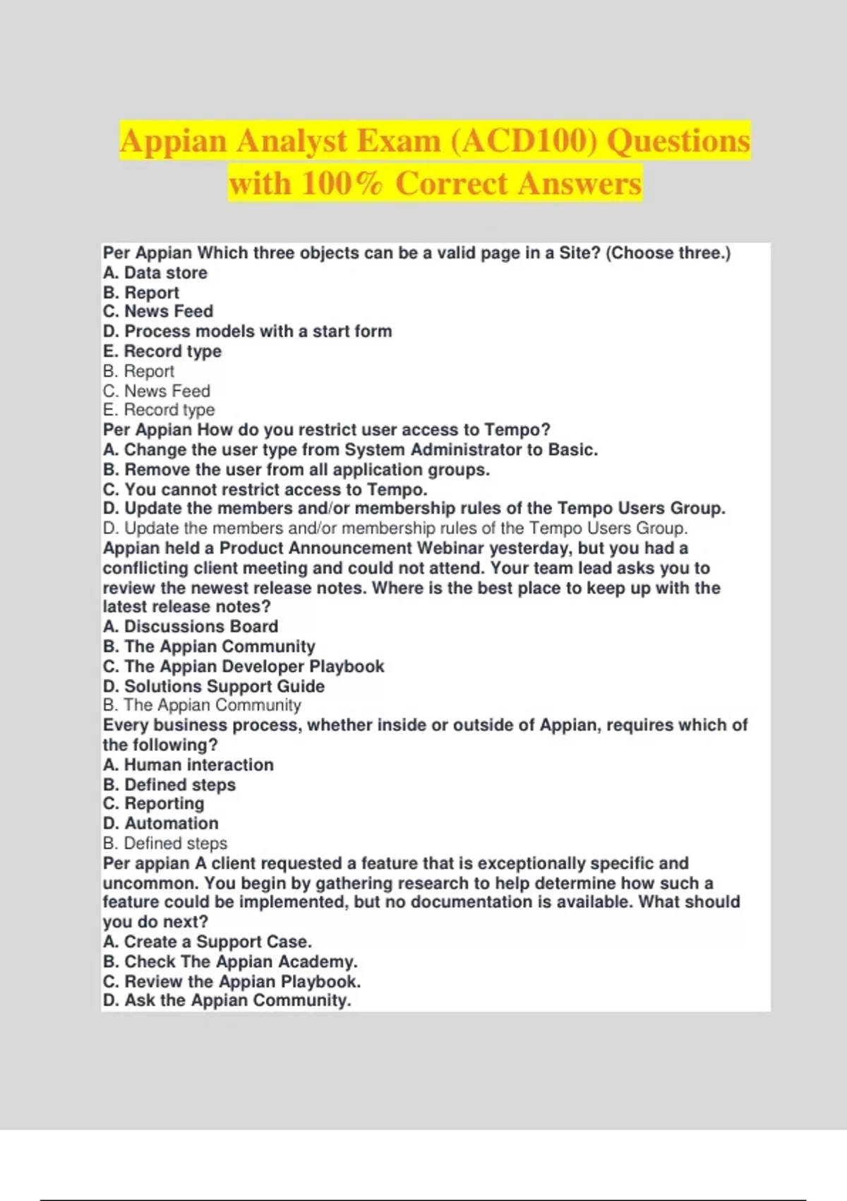 Appian Analyst Exam (ACD100) Questions with 100% Correct Answers Per Appian Which three objects can be a valid page in a Site? (Choose three.) A. Data store B. Report C. News Feed D. Process models with a start form E. Record type B. Report C. News Feed E. Record type Per Appian How do you restrict user access to Tempo? A. Change the user type from System Administrator to Basic. B. Remove the user from all application groups. C. You cannot restrict access to Tempo. D. Update the members and/or membership rules of the Tempo Users Group. D. Update the members and/or membership rules of the Tempo Users Group. Appian held a Product Announcement Webinar yesterday, but you had a conflicting client meeting and could not attend. Your team lead asks you to review the newest release notes. Where is the best place to keep up with the latest release notes? A. Discussions Board B. The Appian Community C. The Appian Developer Playbook D. Solutions Support Guide B. The Appian Community Every business process, whether inside or outside of Appian, requires which of the following? A. Human interaction B. Defined steps C. Reporting D. Automation B. Defined steps Per appian A client requested a feature that is exceptionally specific and uncommon. You begin by gathering research to help determine how such a feature could be implemented, but no documentation is available. What should you do next? A. Create a Support Case. B. Check The Appian Academy. C. Review the Appian Playbook. D. Ask the Appian Community. D. Ask the Appian Community. At what stage are you most likely to regularly refine the backlog? A. Optimize B. Release C. Build D. Initiate C. Build Per appian A feature is being deployed to the test environment. In which environment is unit testing performed for the feature? A. Upgrade B. Development C. Production D. Staging B. Development Per Appian Who is responsible for estimating the level of effort for Product Backlog items? A. Product Owner B. Testers C. Developers D. Scrum Master C. Developers During what stage of the Appian Delivery Methodology does story-pointing regularly occur? A. Build B. Optimize C. Release D. Initiate A. Build Per appian In the scrum lifecycle of a project, when should the team agree on the requirements for the Definition of Done? A. Before getting started on the project B. During the sprint retrospective C. During the backlog refinement D. After the sprint planning A. Before getting started on the project Per Appian You need to query some data from the database using more than one filter. Which parameter for a!query() should you use to define your filters? A. filter B. logicalExpression C. aggregation D. selection B. logicalExpression Per Appian A client asks you to store work location information for their employees. The client mentions that multiple employees may be assigned to multiple work locations. Which type of database relationship is the client describing? A. One-to-Many (1:N) B. Many-to-One (N:1) C. Many-to-Many (M:N) D. One-to-One (1:1) C. Many-to-Many (M:N) Per Appian You need to update the table structure in the database, and then update the related CDT in Appian to publish the data store entity. Column names in the database and the CDT are implemented using different naming conventions. Which statement is appropriate in this scenario? A. You can update the CDT columns in Appian Designer, or update the CDT- related XSD and create a new version from that. B. You must update the CDT columns in Appian Designer. C. You don't need to make any manual changes. Appian automatically updates the CDT according to database chances. D. You must update the CDT-related XSD and create a new version from that. A. You can update the CDT columns in Appian Designer, or update the CDT-related XSD and create a new version from that. Per Appian During User Acceptance Testing (UAT), a tester operating in the test environment asks you to change a data point in one of the tables. In the development environment, you navigate to the database and adjust the data point that the tester described. What is the issue with the steps taken? A. According to Appian best practices, changes s