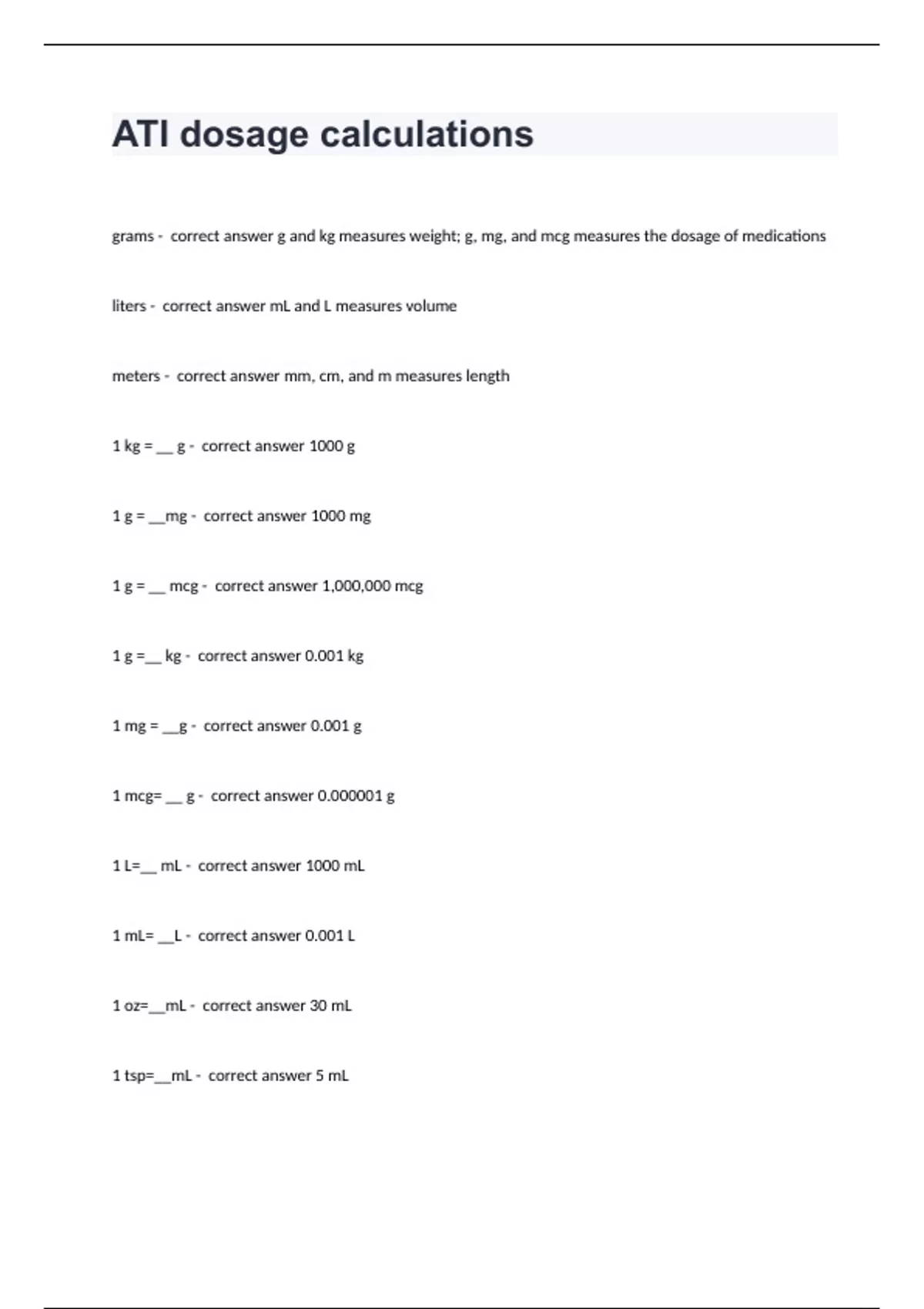 ATI dosage calculationsgrams - correct answer g and kg measures weight; g, mg, and mcg measures the dosage of medications liters - correct answer mL and L measures volume meters - correct answer mm, cm, and m measures length 1 kg = __ g - correct answer 1000 g 1 g = __mg - correct answer 1000 mg 1 g = __ mcg - correct answer 1,000,000 mcg 1 g =__ kg - correct answer 0.001 kg 1 mg = __g - correct answer 0.001 g 1 mcg= __ g - correct answer 0.000001 g 1 L=__ mL - correct answer 1000 mL 1 mL= __L - correct answer 0.001 L 1 oz=__mL - correct answer 30 mL 1 tsp=__mL - correct answer 5 mL