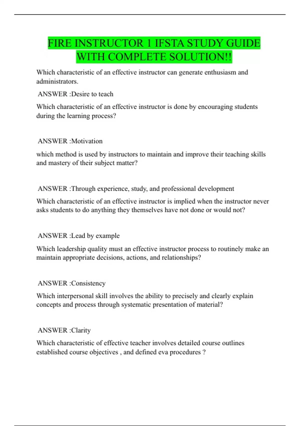 FIRE INSTRUCTOR 1 IFSTA STUDY GUIDE WITH COMPLETE SOLUTION!!