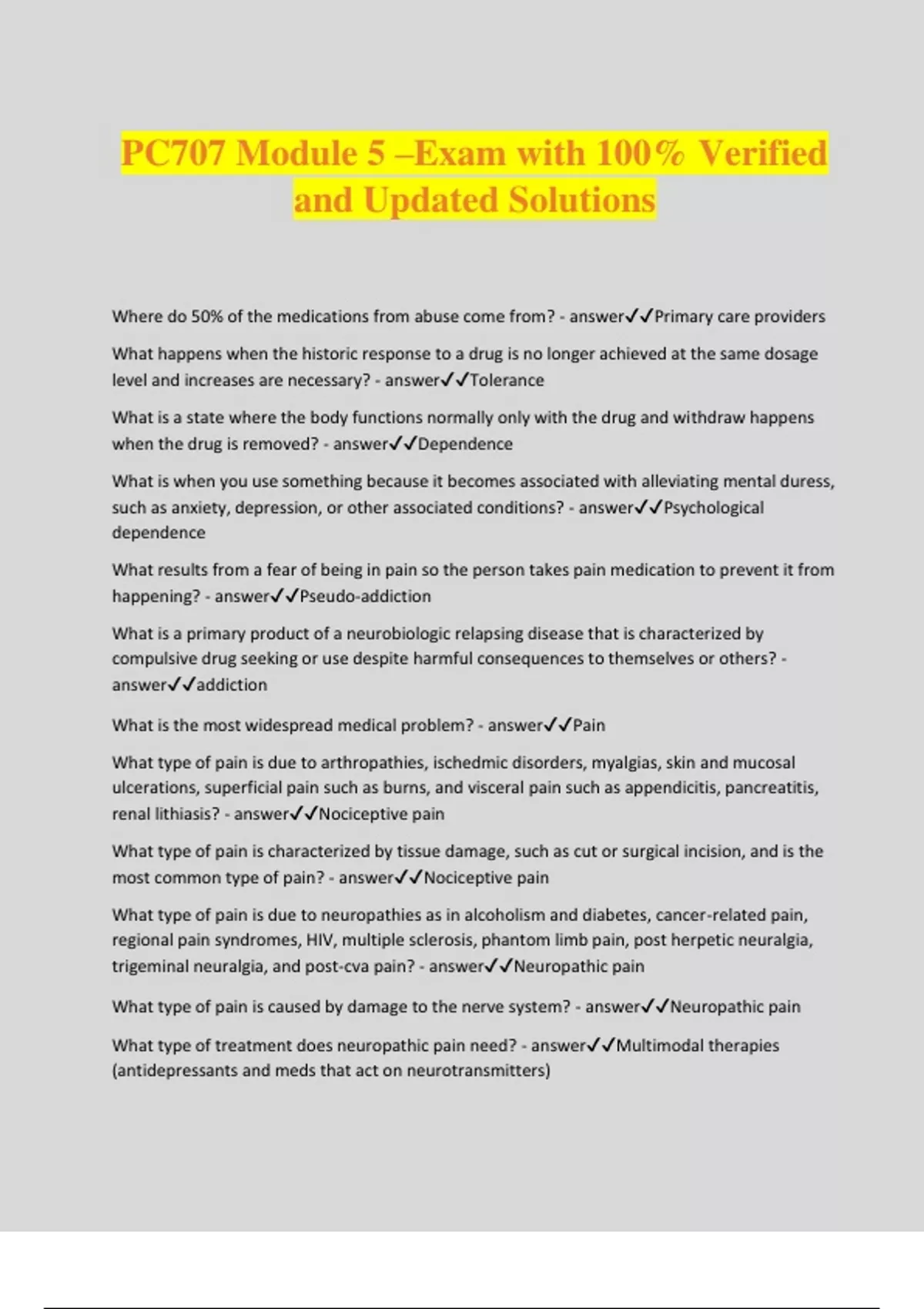 PC707 Module 5 –Exam with 100% Verified and Updated Solutions Where do 50% of the medications from abuse come from? - answerPrimary care providers What happens when the historic response to a drug is no longer achieved at the same dosage level and increases are necessary? - answerTolerance What is a state where the body functions normally only with the drug and withdraw happens when the drug is removed? - answerDependence What is when you use something because it becomes associated with alleviating mental duress, such as anxiety, depression, or other associated conditions? - answerPsychological dependence What results from a fear of being in pain so the person takes pain medication to prevent it from happening? - answerPseudo-addiction What is a primary product of a neurobiologic relapsing disease that is characterized by compulsive drug seeking or use despite harmful consequences to themselves or others? - answeraddiction What is the most widespread medical problem? - answerPain What type of pain is due to arthropathies, ischedmic disorders, myalgias, skin and mucosal ulcerations, superficial pain such as burns, and visceral pain such as appendicitis, pancreatitis, renal lithiasis? - answerNociceptive pain What type of pain is characterized by tissue damage, such as cut or surgical incision, and is the most common type of pain? - answerNociceptive pain What type of pain is due to neuropathies as in alcoholism and diabetes, cancer-related pain, regional pain syndromes, HIV, multiple sclerosis, phantom limb pain, post herpetic neuralgia, trigeminal neuralgia, and post-cva pain? - answerNeuropathic pain What type of pain is caused by damage to the nerve system? - answerNeuropathic pain What type of treatment does neuropathic pain need? - answerMultimodal therapies (antidepressants and meds that act on neurotransmitters) What type of pain is due to chronic or recurrent headaches, vasculitis? - answerMixed or underdetermined etiology What is the first step to prescribing opioids safely? - answerpatient history What histories are included on a patient who could potentially receive opioid treatment? - answer(1) social history (2) drug abuse history (3) depression screening (4) alcohol use (5) urine drug test (6) copy of other medical records (7) opioid drug use assessment What would you have a patient sign if they plan on using opioids? - answerInformed consent/patient-provider agreement If a person has a history of opioid usage/abuse, would that mean that you cannot prescribe them opioids for pain? - answerNo If a person has a history of opioid usage/abuse, what would you do to help treat their pain? - answerRefer to pain management specialist What needs to be included in documentation for referral to pain management specialist? - answerWhy the person is being referred What are the risks to prescribing opioids? - answer(1) respiratory depression (2) developing tolerance or dependence (3) overdose (4) drug interactions (5) risk of neonatal withdraw syndrome (6) inadvertent child use (7) abuse or misuse by patient or other family member What is the purpose of the patient-provider agreement when prescribing opioids? - answer(1) risks (2) responsibilities (3) expected behaviors and consequences for misuse What does the patient-provider agreement do for the prescriber? - answerGives them an exit strategy What can mild pain managed with? - answerNonopiods What is the first route of pain medication? - answerPO Should you prescribe 2 long acting opioids together? - answerNo What are red flag behaviors? - answer(1) ask for dose adjustments (2) ongoing delays for planned surgery (3) providers who make risk assessment without physical assessment (4) history of requesting early refills (5) patient who risk nonopioid treatment plan (6) will not allow urine drug screen (7) when patients are not safeguarding medications (8) when patients have frequent after hour emergency room visits If a patient has anxiety but also needs an opioid prescription for pain, what other drug would you want to make sure they are not taking? - answerBenzodiaz