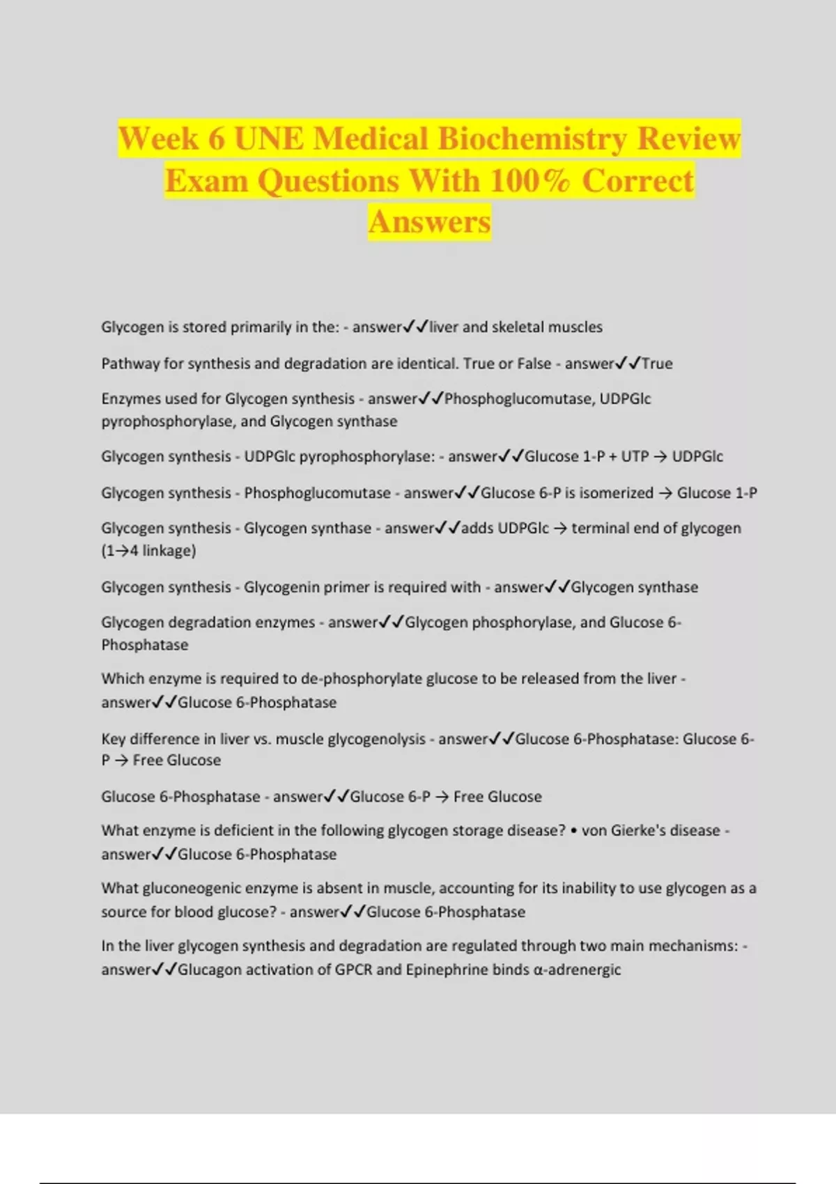 Week 6 UNE Medical Biochemistry Review Exam Questions With 100% Correct Answers