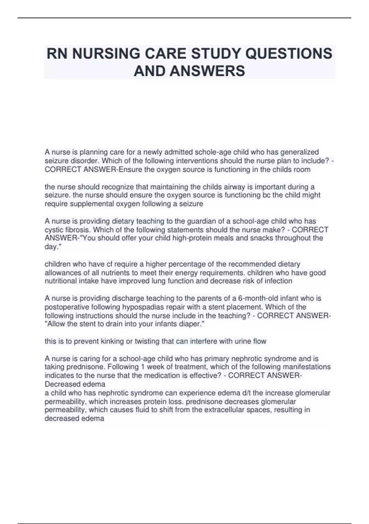 RN NURSING CARE STUDY QUESTIONS AND ANSWERS A nurse is planning care for a newly admitted schole-age child who has generalized seizure disorder. Which of the following interventions should the nurse plan to include? - CORRECT ANSWER-Ensure the oxygen source is functioning in the childs room the nurse should recognize that maintaining the childs airway is important during a seizure. the nurse should ensure the oxygen source is functioning bc the child might require supplemental oxygen following a seizure A nurse is providing dietary teaching to the guardian of a school-age child who has cystic fibrosis. Which of the following statements should the nurse make? - CORRECT ANSWER-"You should offer your child high-protein meals and snacks throughout the day." children who have cf require a higher percentage of the recommended dietary allowances of all nutrients to meet their energy requirements. children who have good nutritional intake have improved lung function and decrease risk of infection A nurse is providing discharge teaching to the parents of a 6-month-old infant who is postoperative following hypospadias repair with a stent placement. Which of the following instructions should the nurse include in the teaching? - CORRECT ANSWER- "Allow the stent to drain into your infants diaper." this is to prevent kinking or twisting that can interfere with urine flow A nurse is caring for a school-age child who has primary nephrotic syndrome and is taking prednisone. Following 1 week of treatment, which of the following manifestations indicates to the nurse that the medication is effective? - CORRECT ANSWER- Decreased edema a child who has nephrotic syndrome can experience edema d/t the increase glomerular permeability, which increases protein loss. prednisone decreases glomerular permeability, which causes fluid to shift from the extracellular spaces, resulting in decreased edema A nurse is receiving change-of-shift report for four children. Which of the following children should the nurse assess first? - CORRECT ANSWER-A toddler who has a concussion and an episode of forceful vomiting. when using urgent vs. nonurgent approach to pt care, the nurse should assess this child first. an episode of forceful vomiting is an indication of increased ICP in a toddler who has a concussion A nurse is providing discharge teaching to the guardians of a toddler who had lower leg cast applied 24 hr ago. The nurse should instruct the guardians to report which of the following finding to the provider? - CORRECT ANSWER-Restricted ability to move the toes. this is an indication of neurovascular compromise and requires immediate notification of the provider. permanent muscle and tissue damage can occur in just a few hours A nurse in an emergency department is auscultating the lungs of an adolescent who is experiencing dyspnea. The nurse should identify the sound as which of the following? - CORRECT ANSWER-Wheezes wheezes are high-pitched, musical or whistling-like sounds heard primarily on expiration as air passes through and vibrate narrowed airways A nurse is caring for a preschooler who has congestive heart failure. The nurse observes wide QRS complexes and peaked T waves on the cardiac monitor. Which of the following prescriptions should the nurse clarify with the provider? - CORRECT ANSWER-Potassium Chloride the nurse should identify that a child who has a chf can develop e imbalances such as hyper hypokalemia. the nurse should identify that the child is exhibiting manifestations of hyperkalemia and contact the MD about the admin of this which can increase the severity of hyperkalemia A nurse is planning an educational program for school-age children and their parents about bicycle safety. Which of the following information should the nurse plan to include? - CORRECT ANSWER-The child should be able to stand on the balls of their feet when sitting on the bike. to decrease the risk of injury, parents should ensure that the bike is the correct size for the child. when seated on the bike, the child should be able to stand with the ball of each foot touching the ground and should be able to stand with each foot flat on the ground when straddling the bikes center A nurse is monitoring the oxygen saturation level of an infant using pulse oximetry. The nurse should secure the sensor to which of the following areas on the infant? - CORRECT ANSWER-Great Toe the nurse should secure the sensor to the great toe of the infant and then place a snug- fitting sock on the foot to hold the sensor in place. the nurse should also check the skin under the sensor site frequently for temp, color, and the presence of a pulse A nurse is an emergency department is caring for a school-age child who has epiglottitis. Which of the following actions should the nurse take? - CORRECT ANSWER-Monitor the childs oxygen saturation b/c the child is experiencing acute resp distress and it is necessary to determine if the child is responding to tx A nurse in an emergency department is caring for a school-age child who has sustained a minor superficial burn from fireworks on their forearm. Which of the following actions should the nurse take? - CORRECT ANSWER-Apply an antimicrobial ointment to the affected area. to prevent infection A nurse in a providers office is caring for a school-age child who has varicella. The parents asks the nurse when their child will no longer be contagious. Which of the following responses should the nurse make? - CORRECT ANSWER-"When your childs lesions are crusted, usually 6 days after they appear." the nurse should inform the parent that the child is contagious 1 day prior to lesion eruption and until the vesicles have crusted over, which usually takes about 6 days A nurse is providing discharge teaching to the parent of a school-age child who has moderate persistant asthma. Which of the following instructions should the nurse include? - CORRECT ANSWER-"Pulmonary function tests will be performed every 12 to 24 months to 