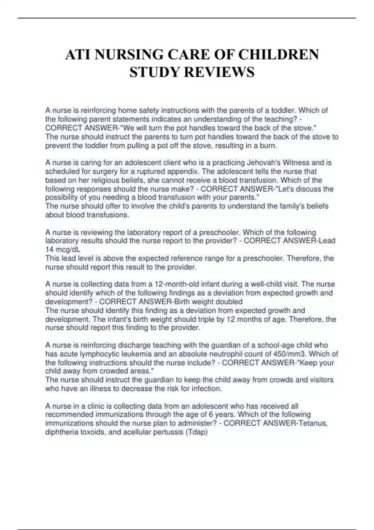 ATI NURSING CARE OF CHILDREN STUDY REVIEWS A nurse is reinforcing home safety instructions with the parents of a toddler. Which of the following parent statements indicates an understanding of the teaching? - CORRECT ANSWER-"We will turn the pot handles toward the back of the stove." The nurse should instruct the parents to turn pot handles toward the back of the stove to prevent the toddler from pulling a pot off the stove, resulting in a burn. A nurse is caring for an adolescent client who is a practicing Jehovah's Witness and is scheduled for surgery for a ruptured appendix. The adolescent tells the nurse that based on her religious beliefs, she cannot receive a blood transfusion. Which of the following responses should the nurse make? - CORRECT ANSWER-"Let's discuss the possibility of you needing a blood transfusion with your parents." The nurse should offer to involve the child's parents to understand the family's beliefs about blood transfusions. A nurse is reviewing the laboratory report of a preschooler. Which of the following laboratory results should the nurse report to the provider? - CORRECT ANSWER-Lead 14 mcg/dL This lead level is above the expected reference range for a preschooler. Therefore, the nurse should report this result to the provider. A nurse is collecting data from a 12-month-old infant during a well-child visit. The nurse should identify which of the following findings as a deviation from expected growth and development? - CORRECT ANSWER-Birth weight doubled The nurse should identify this finding as a deviation from expected growth and development. The infant's birth weight should triple by 12 months of age. Therefore, the nurse should report this finding to the provider. A nurse is reinforcing discharge teaching with the guardian of a school-age child who has acute lymphocytic leukemia and an absolute neutrophil count of 450/mm3. Which of the following instructions should the nurse include? - CORRECT ANSWER-"Keep your child away from crowded areas." The nurse should instruct the guardian to keep the child away from crowds and visitors who have an illness to decrease the risk for infection. A nurse in a clinic is collecting data from an adolescent who has received all recommended immunizations through the age of 6 years. Which of the following immunizations should the nurse plan to administer? - CORRECT ANSWER-Tetanus, diphtheria toxoids, and acellular pertussis (Tdap) The Tdap vaccine is recommended between the ages of 11 and 12 years. Therefore, this adolescent should receive the Tdap vaccine now. A nurse is reinforcing teaching with the parent of a child who has a new prescription for ferrous sulfate. The nurse should reinforce that the parent should administer the medication with which of the following fluids to enhance the medication absorption? - CORRECT ANSWER-Orange juice The nurse should reinforce with the parent that administering ferrous sulfate with orange juice will enhance medication absorption. A nurse in a pediatric clinic is observing for an anaphylactic reaction after administering an IM antibiotic to a child 5 min ago. Which of the following manifestations should the nurse expect to observe first? - CORRECT ANSWER-Hives The nurse should observe for hives first because this is an early manifestation of an anaphylactic reaction. A nurse is reinforcing dietary teaching about a low-sodium diet with the parents of a child who is recovering from acute glomerulonephritis. Which of the following food choices by the parents indicates an understanding of the teaching? - CORRECT ANSWER-Apples The nurse should instruct the parents that apples are low in sodium and supply the child with energy needed for recovery. A nurse is collecting data from a 12-month-old infant during a well-child visit. Which of the following findings should the nurse report to the provider? - CORRECT ANSWER- BP 115/70 mm Hg The nurse should identify that this blood pressure is above the expected reference range for a 12-month-old infant and report this finding to the provider. A nurse is reinforcing discharge teaching with the guardian of a child who has juvenile idiopathic arthritis (JIA). Which of the following statements by the parent indicates an understanding of the teaching? - CORRECT ANSWER-"I will have my child sleep in knee, wrist, and hand splints." The nurse should reinforce with the guardian that splinting the child's joints at night will decrease pain and enhance joint function. A nurse is collecting data about the dietary habits of an adolescent client. The nurse should identify that which of the following findings puts the client at risk for nutritional deficits? - CORRECT ANSWER-The client skips eating dinner for track practice three times per week. The nurse should identify that adolescents are often at risk for developing poor eating habits. Skipping dinner twice each week puts this client at risk for nutritional deficits. A nurse is reinforcing teaching with the guardians of a school-age child who has hearing loss. Which of the following techniques should the nurse recommend to facilitate communication with the child? - CORRECT ANSWER-Speak at the child's eye level. The nurse should instruct the guardian to speak at the child's eye level and ensure that there is adequate lighting on the speaker's face to facilitate lipreading and communication. A nurse is assisting with a sterile dressing change for an adolescent who has a partial thickness burn on the right hip. Which of the following actions should the nurse take first? - CORRECT ANSWER-Administer pain medication to the client. According to evidence-based practice, the nurse should first provide pain medication to the client to reduce discomfort during the procedure. A nurse is reviewing the laboratory report of a school-age child who is receiving prednisone. Which of the following laboratory results should the nurse report to the provider? - CORRECT ANSWER-Sodium 150 mEq/L Hypernatremia is an adverse effect o