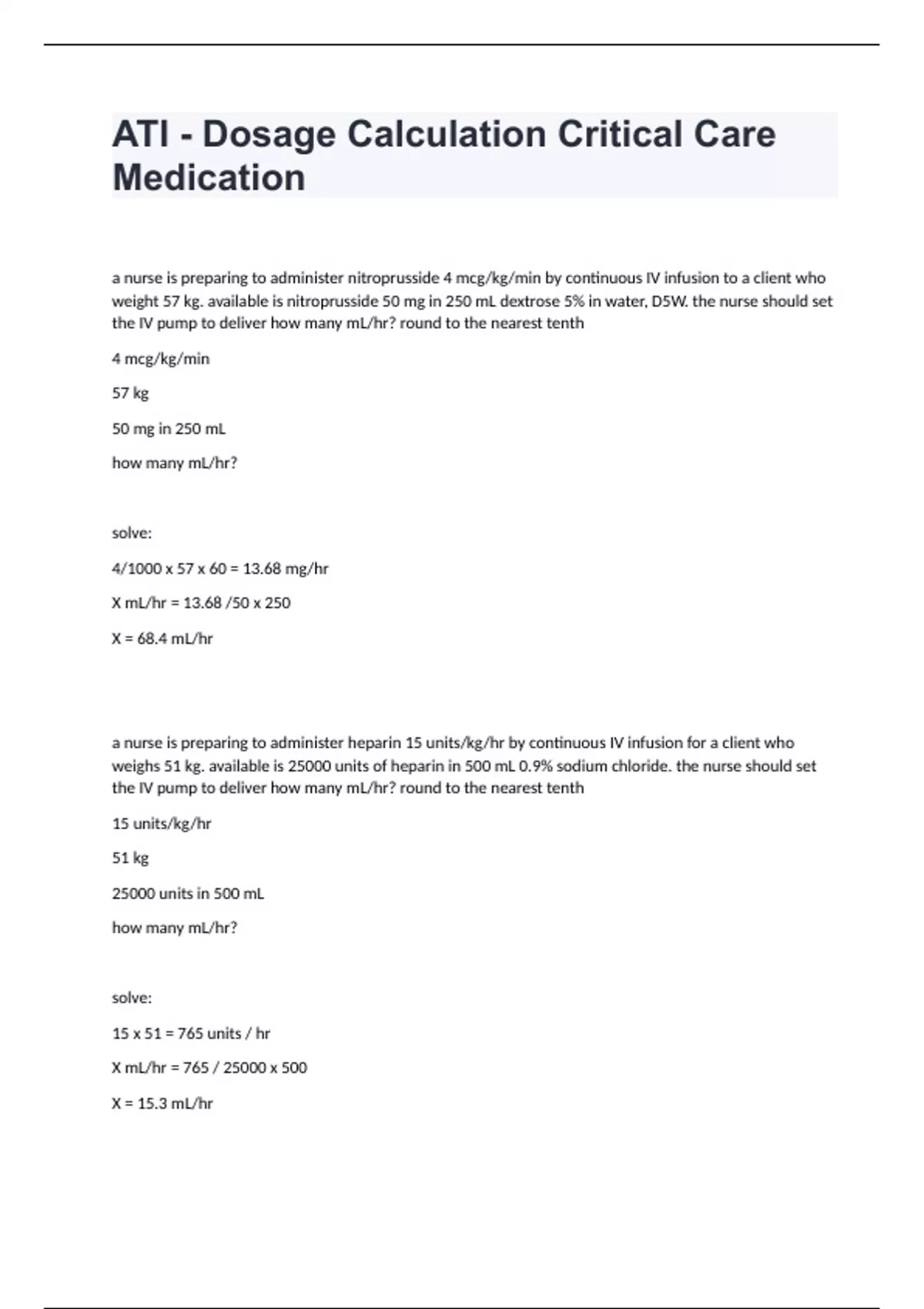 ATI - Dosage Calculation Critical Care Medicationa nurse is preparing to administer nitroprusside 4 mcg/kg/min by continuous IV infusion to a client who weight 57 kg. available is nitroprusside 50 mg in 250 mL dextrose 5% in water, D5W. the nurse should set the IV pump to deliver how many mL/hr? round to the nearest tenth 4 mcg/kg/min 57 kg 50 mg in 250 mL how many mL/hr? solve: 4/1000 x 57 x 60 = 13.68 mg/hr X mL/hr = 13.68 /50 x 250 X = 68.4 mL/hr a nurse is preparing to administer heparin 15 units/kg/hr by continuous IV infusion for a client who weighs 51 kg. available is 25000 units of heparin in 500 mL 0.9% sodium chloride. the nurse should set the IV pump to deliver how many mL/hr? round to the nearest tenth 15 units/kg/hr 51 kg 25000 units in 500 mL how many mL/hr? solve: 15 x 51 = 765 units / hr X mL/hr = 765 / 25000 x 500 X = 15.3 mL/hr
