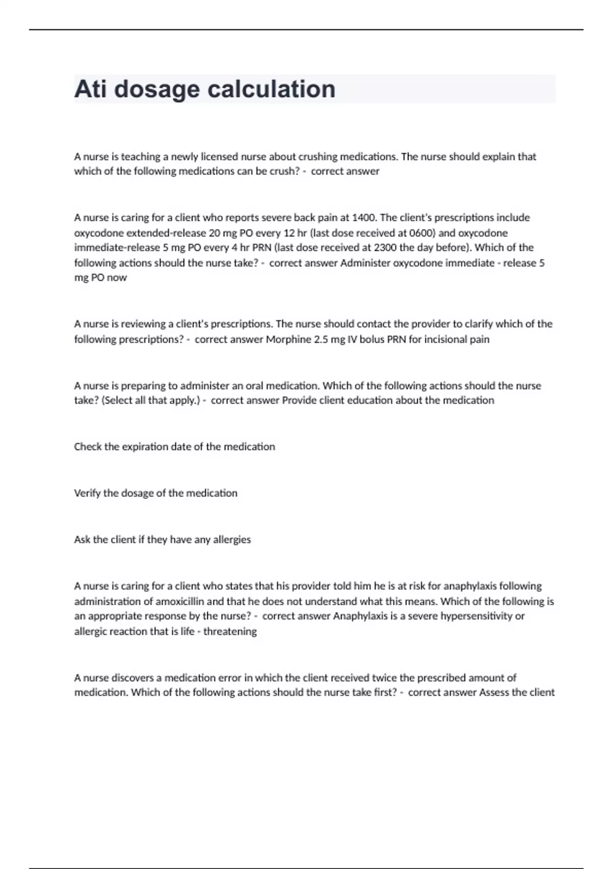 Ati dosage calculation A nurse is teaching a newly licensed nurse about crushing medications. The nurse should explain that which of the following medications can be crush? - correct answer A nurse is caring for a client who reports severe back pain at 1400. The client's prescriptions include oxycodone extended-release 20 mg PO every 12 hr (last dose received at 0600) and oxycodone immediate-release 5 mg PO every 4 hr PRN (last dose received at 2300 the day before). Which of the following actions should the nurse take? - correct answer Administer oxycodone immediate - release 5 mg PO now A nurse is reviewing a client's prescriptions. The nurse should contact the provider to clarify which of the following prescriptions? - correct answer Morphine 2.5 mg IV bolus PRN for incisional pain A nurse is preparing to administer an oral medication. Which of the following actions should the nurse take? (Select all that apply.) - correct answer Provide client education about the medication Check the expiration date of the medication Verify the dosage of the medication Ask the client if they have any allergies A nurse is caring for a client who states that his provider told him he is at risk for anaphylaxis following administration of amoxicillin and that he does not understand what this means. Which of the following is an appropriate response by the nurse? - correct answer Anaphylaxis is a severe hypersensitivity or allergic reaction that is life - threatening A nurse discovers a medication error in which the client received twice the prescribed amount of medication. Which of the following actions should the nurse take first? - correct answer Assess the client