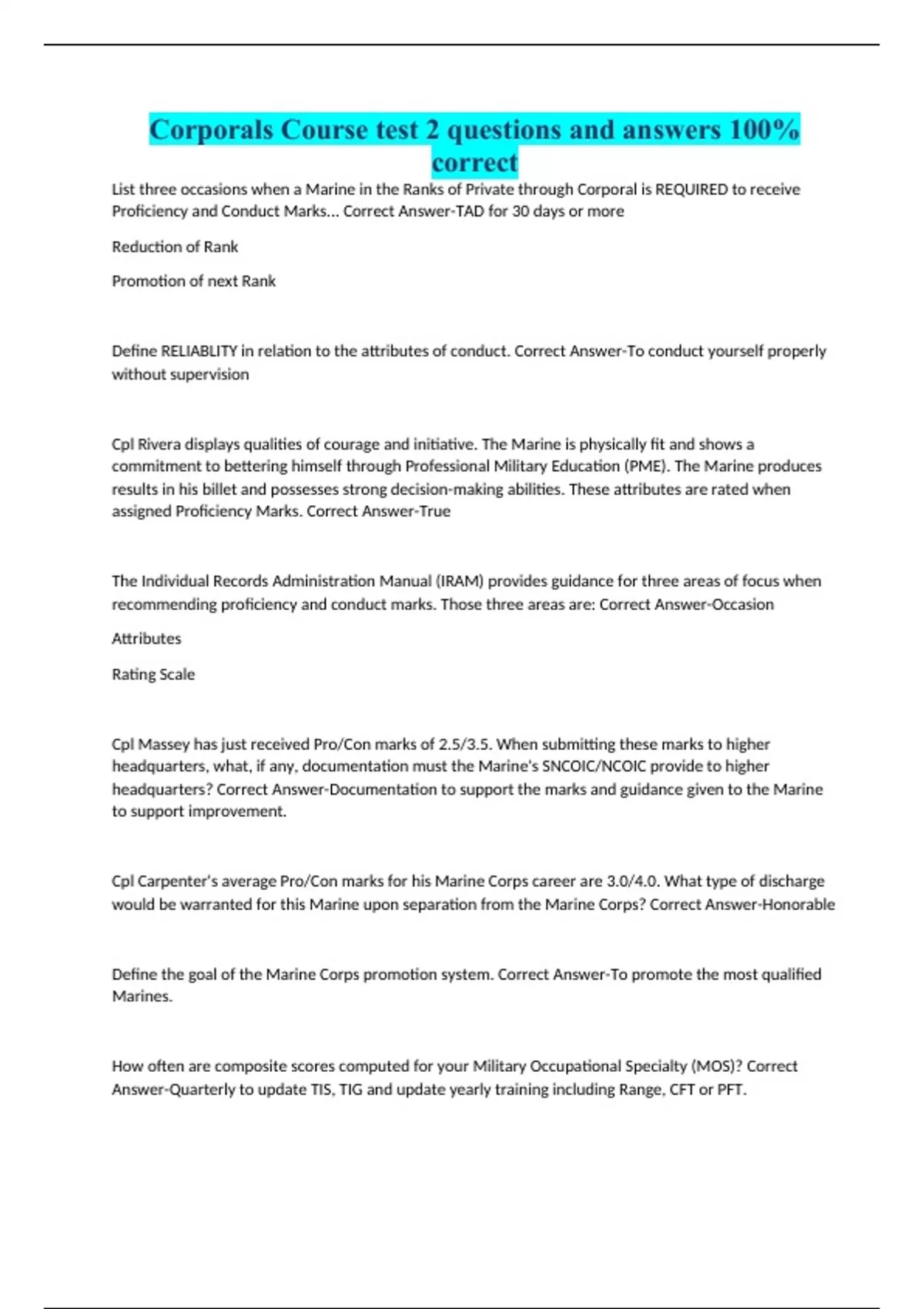 Corporals Course test 2 questions and answers 100% correct List three occasions when a Marine in the Ranks of Private through Corporal is REQUIRED to receive Proficiency and Conduct Marks... Correct Answer-TAD for 30 days or more Reduction of Rank Promotion of next Rank Define RELIABLITY in relation to the attributes of conduct. Correct Answer-To conduct yourself properly without supervision Cpl Rivera displays qualities of courage and initiative. The Marine is physically fit and shows a commitment to bettering himself through Professional Military Education (PME). The Marine produces results in his billet and possesses strong decision-making abilities. These attributes are rated when assigned Proficiency Marks. Correct Answer-True The Individual Records Administration Manual (IRAM) provides guidance for three areas of focus when recommending proficiency and conduct marks. Those three areas are: Correct Answer-Occasion Attributes Rating Scale Cpl Massey has just received Pro/Con marks of 2.5/3.5. When submitting these marks to higher headquarters, what, if any, documentation must the Marine's SNCOIC/NCOIC provide to higher headquarters? Correct Answer-Documentation to support the marks and guidance given to the Marine to support improvement. Cpl Carpenter's average Pro/Con marks for his Marine Corps career are 3.0/4.0. What type of discharge would be warranted for this Marine upon separation from the Marine Corps? Correct Answer-Honorable Define the goal of the Marine Corps promotion system. Correct Answer-To promote the most qualified Marines. How often are composite scores computed for your Military Occupational Specialty (MOS)? Correct Answer-Quarterly to update TIS, TIG and update yearly training including Range, CFT or PFT.