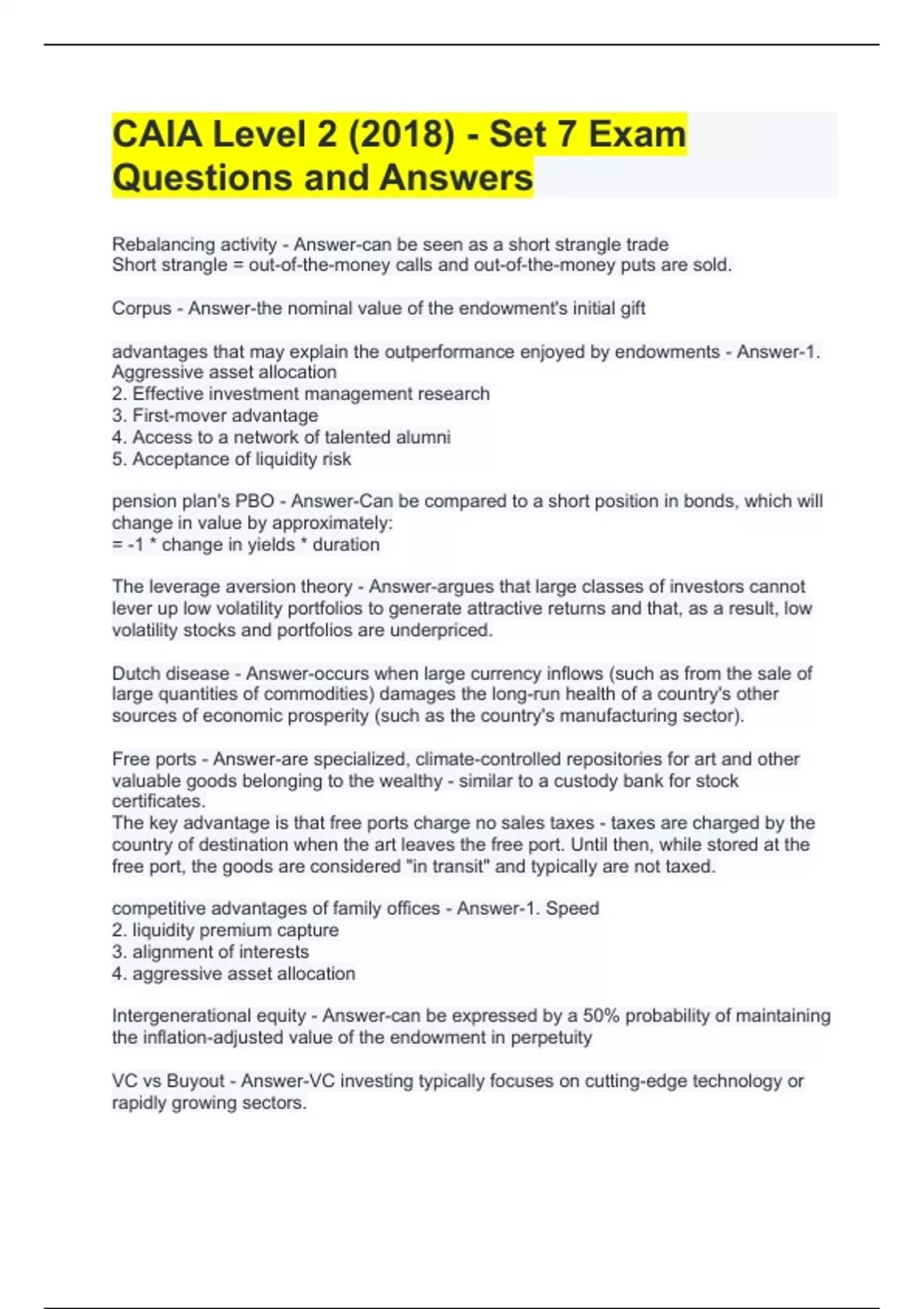 Rebalancing activity - Answer-can be seen as a short strangle trade Short strangle = out-of-the-money calls and out-of-the-money puts are sold. Corpus - Answer-the nominal value of the endowment's initial gift advantages that may explain the outperformance enjoyed by endowments - Answer-1. Aggressive asset allocation 2. Effective investment management research 3. First-mover advantage 4. Access to a network of talented alumni 5. Acceptance of liquidity risk pension plan's PBO - Answer-Can be compared to a short position in bonds, which will change in value by approximately: = -1 * change in yields * duration The leverage aversion theory - Answer-argues that large classes of investors cannot lever up low volatility portfolios to generate attractive returns and that, as a result, low volatility stocks and portfolios are underpriced. Dutch disease - Answer-occurs when large currency inflows (such as from the sale of large quantities of commodities) damages the long-run health of a country's other sources of economic prosperity (such as the country's manufacturing sector). Free ports - Answer-are specialized, climate-controlled repositories for art and other valuable goods belonging to the wealthy - similar to a custody bank for stock certificates. The key advantage is that free ports charge no sales taxes - taxes are charged by the country of destination when the art leaves the free port. Until then, while stored at the free port, the goods are considered "in transit" and typically are not taxed. competitive advantages of family offices - Answer-1. Speed 2. liquidity premium capture 3. alignment of interests 4. aggressive asset allocation Intergenerational equity - Answer-can be expressed by a 50% probability of maintaining the inflation-adjusted value of the endowment in perpetuity VC vs Buyout - Answer-VC investing typically focuses on cutting-edge technology or rapidly growing sectors.