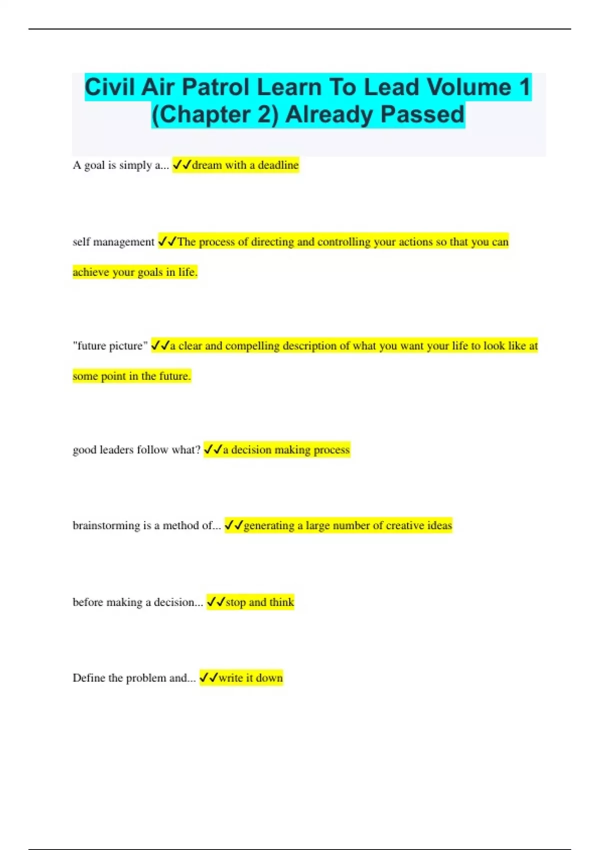Civil Air Patrol Learn To Lead Volume 1 (Chapter 2) Already Passed A goal is simply a... dream with a deadline self management The process of directing and controlling your actions so that you can achieve your goals in life. "future picture" a clear and compelling description of what you want your life to look like at some point in the future. good leaders follow what? a decision making process brainstorming is a method of... generating a large number of creative ideas before making a decision... stop and think Define the problem and... write it down good leaders... re-evaluate their decisions and change course if necessary Leaders who make bad initial decisions
