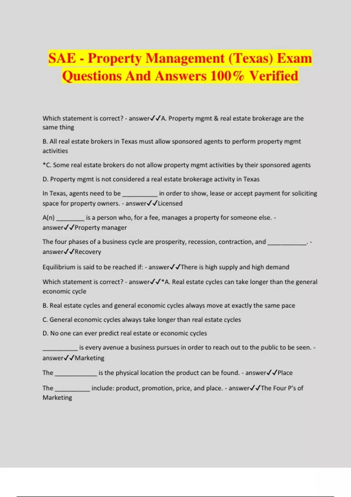 SAE - Property Management (Texas) Exam Questions And Answers 100% Verified Which statement is correct? - answerA. Property mgmt & real estate brokerage are the same thing B. All real estate brokers in Texas must allow sponsored agents to perform property mgmt activities *C. Some real estate brokers do not allow property mgmt activities by their sponsored agents D. Property mgmt is not considered a real estate brokerage activity in Texas In Texas, agents need to be __________ in order to show, lease or accept payment for soliciting space for property owners. - answerLicensed A(n) ________ is a person who, for a fee, manages a property for someone else. - answerProperty manager The four phases of a business cycle are prosperity, recession, contraction, and ___________. - answerRecovery Equilibrium is said to be reached if: - answerThere is high supply and high demand Which statement is correct? - answer*A. Real estate cycles can take longer than the general economic cycle B. Real estate cycles and general economic cycles always move at exactly the same pace C. General economic cycles always take longer than real estate cycles D. No one can ever predict real estate or economic cycles __________ is every avenue a business pursues in order to reach out to the public to be seen. - answerMarketing The ____________ is the physical location the product can be found. - answerPlace The __________ include: product, promotion, price, and place. - answerThe Four P's of Marketing Property management companies that operate under the __________ have dedicated property managers who are involved with every aspect of the properties they manage. - answerPortfolio structure _________ are charged to each client to cover all of the services the property manager provides. - answerManagement fees Which of the following is true? - answerA. It is better to be conservative on expenses and liberal on income B. Owners do not usually mind if the actual budget far exceeds the estimated budget C. The actual budget and the estimated budget almost always match exactly *D. When budgeting for owners, property managers need to be conservative on income and liberal on expenses The fiduciary duties a property manager owes to the owner are _________, loyalty, disclosure, confidentiality, accounting, and reasonable care. - answerObedience Which of the following should be included in a property management agreement? - answerA. Policies and procedures for the repair of the property B. Duties and responsibilities of the property manger C. The management term *D. All of these Which statement regarding reserves is incorrect? - answerA. Reserve amounts are established based on the age, size, and residential profile of the property B. Older, larger properties will need more money in reserves to pay for repairs, etc. C. Reserves are held by the property manager to pay services providers and other costs associated with managing the property *D. The money for reserves comes from the property manager's own business accounts A solid, written rent collection policy should include: - answerA. Suggestions for fire safety *B. When to pay C. Repair request forms D. Lease renewal policies Typically, most property managers will not accept __________ for rent payments - answerCash A property manager may not charge a late fee unless: - answerIt is clearly stated in the written lease Directions: Read the scenario and answer the questions that follow. Investor Mike owns a 200- unit residential property. For the last two years, rents have stayed the same because Mike subscribes to the philosophy that 100% occupancy is better than losing tenants to his competitors. After attending a real estate investment seminar, Mike realizes that by not raising rents for the last two years he has been missing out on literally thousands of dollars in profit. He believes that the market will support a rental increase, yet he is hesitant of raising the rents so much that his good tenants will get angry and move elsewhere. After doing some research into raising rental rates, Mike is now motivated and wants to raise the value of his asset, so he calls up his property manager, Jay, and informs him that he needs to raise the rent on each unit by 5% per month in the next 12 months as lease terms expire or units are re-lea - answerA. $900 *B. $9,000 C. $2,000 D. $200 Directions: Read the scenario and ans