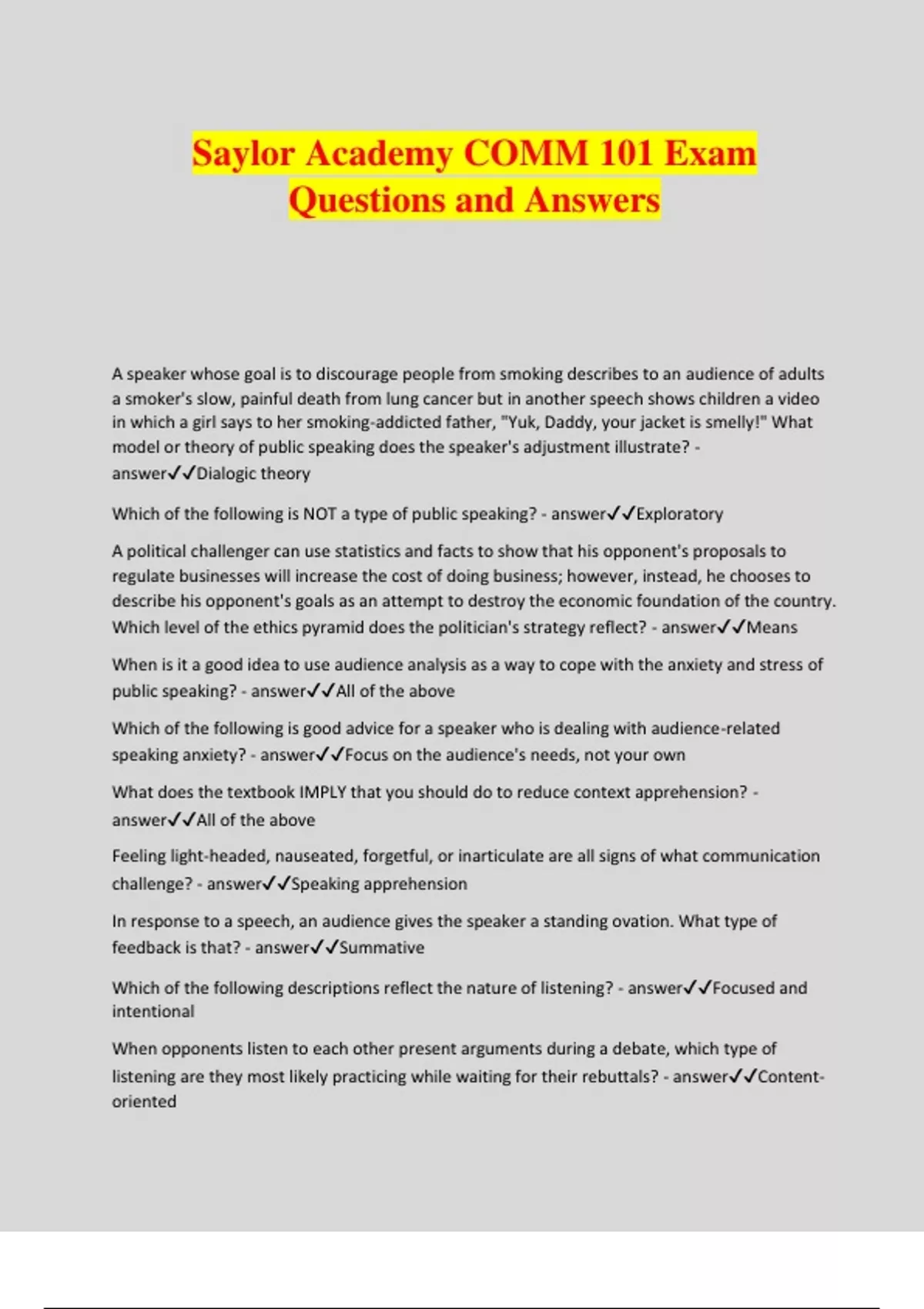 Saylor Academy COMM 101 Exam Questions and Answers A speaker whose goal is to discourage people from smoking describes to an audience of adults a smoker's slow, painful death from lung cancer but in another speech shows children a video in which a girl says to her smoking-addicted father, "Yuk, Daddy, your jacket is smelly!" What model or theory of public speaking does the speaker's adjustment illustrate? - answerDialogic theory Which of the following is NOT a type of public speaking? - answerExploratory A political challenger can use statistics and facts to show that his opponent's proposals to regulate businesses will increase the cost of doing business; however, instead, he chooses to describe his opponent's goals as an attempt to destroy the economic foundation of the country. Which level of the ethics pyramid does the politician's strategy reflect? - answerMeans When is it a good idea to use audience analysis as a way to cope with the anxiety and stress of public speaking? - answerAll of the above Which of the following is good advice for a speaker who is dealing with audience-related speaking anxiety? - answerFocus on the audience's needs, not your own What does the textbook IMPLY that you should do to reduce context apprehension? - answerAll of the above Feeling light-headed, nauseated, forgetful, or inarticulate are all signs of what communication challenge? - answerSpeaking apprehension In response to a speech, an audience gives the speaker a standing ovation. What type of feedback is that? - answerSummative Which of the following descriptions reflect the nature of listening? - answerFocused and intentional When opponents listen to each other present arguments during a debate, which type of listening are they most likely practicing while waiting for their rebuttals? - answerContent- oriented Of the five stages of listening, which one follows understanding? - answerRemembering You are government official speaking to an audience of senior citizens about changes in their government-sponsored health care benefits. Which of the following would be a good way to establish your credibility with that audience? - answerSummarize what you know about the audience's health care concerns and provide information that addresses those concerns Which of the following is the best topic to choose for a speech to high school students? - answer If a radio talk show host tells her followers to watch only one cable news channel, because the other channels are biased, which goal of the NCA Credo for Ethical Communication do her ethics fail to achieve? - answerFreedom of expression, diversity of perspective, and tolerance Which of the following is NOT an example of some of the benefits of learning about and participating in public speaking? - answerLess effort spent on creating speeches Which of the following statements is true? - answerSome nervousness can make your speech better. During a long sermon, a 10-year-old child annoys nearby adults by constantly whining about being hungry and bored. What type(s) of noise are the adults and the child experiencing, and what would be the most effective ways to eliminate those noises? - answerThe child is experiencing physiological noise and the adults are experiencing physical noise. The child should be taken elsewhere or given something to eat to distract him or her. In the meantime, the adults should just try to ignore the child. You are in the living room of your home, about to give a speech to a very large group of neighbors about forming a neighborhood crime watch. Which type of tool should you have used to ensure that your audience receives all of the information you provide as accurately as possible? - answerSituational You are in your living room speaking to a large group of your neighbors about forming a neighborhood crime watch. At one point in your speech, you hold up a poster you created which shows a map of the neighborhood and three security routes watch members will choose from to perform their duties. But when you ask for volunteers to select their preferred routes, the people in the back of the room indicate that they cannot see the poster well enough to choose. What would be the most effective way to respond to this problem? - answerHave someone print out and distribute letter-sized copies of the poster while you discuss other issues. A student is asked to give a 5-minute persuasive speech to his classmates. When he presents a critique his girlfriend's intimate anatomy, he has all of his cla