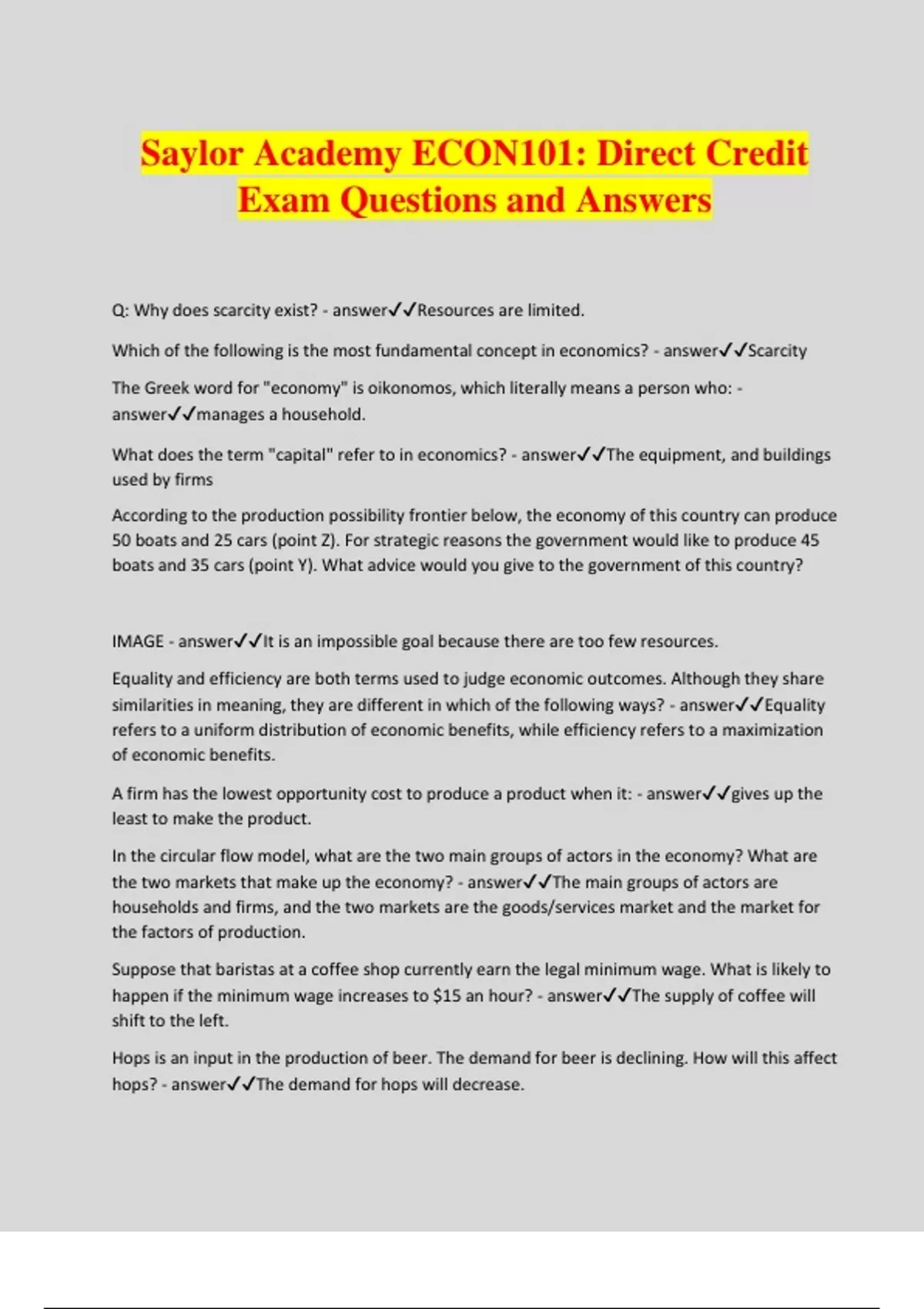 Saylor Academy ECON101: Direct Credit Exam Questions and Answers Q: Why does scarcity exist? - answerResources are limited. Which of the following is the most fundamental concept in economics? - answerScarcity The Greek word for "economy" is oikonomos, which literally means a person who: - answermanages a household. What does the term "capital" refer to in economics? - answerThe equipment, and buildings used by firms According to the production possibility frontier below, the economy of this country can produce 50 boats and 25 cars (point Z). For strategic reasons the government would like to produce 45 boats and 35 cars (point Y). What advice would you give to the government of this country? IMAGE - answerIt is an impossible goal because there are too few resources. Equality and efficiency are both terms used to judge economic outcomes. Although they share similarities in meaning, they are different in which of the following ways? - answerEquality refers to a uniform distribution of economic benefits, while efficiency refers to a maximization of economic benefits. A firm has the lowest opportunity cost to produce a product when it: - answergives up the least to make the product. In the circular flow model, what are the two main groups of actors in the economy? What are the two markets that make up the economy? - answerThe main groups of actors are households and firms, and the two markets are the goods/services market and the market for the factors of production. Suppose that baristas at a coffee shop currently earn the legal minimum wage. What is likely to happen if the minimum wage increases to $15 an hour? - answerThe supply of coffee will shift to the left. Hops is an input in the production of beer. The demand for beer is declining. How will this affect hops? - answerThe demand for hops will decrease. The supply of a good is determined by: - answersellers of the good present in the market Some of the determinants of demand are: - answerprice, price of compliments and tastes/preferences. If producers of a certain product are pessimistic or uncertain about the future business climate, how will the supply of the product behave? - answer-TRY This expectation will affect future supply but not today's supply -NOT This expectation will cause movement along the supply curve. The price for a good decreases in price from $2.50 per unit to $1.50 per unit. As a result, the amount purchased increases from 300 units per day to 500 units per day. What is the price elasticity of demand for this good? - answer-TRY 1.0 The Smith family's income increases by 25%. What impact will this have on their spending habits? - answerThere will be a shift in demand for all goods, and the Smiths will consume more compared to before the increase in income. Effective price control will result in either shortage or surplus. What additional actions are needed to counter these unwanted effects? - answerProduction quotas and rationing must be imposed. The following table presents the supply and demand schedules for volleyballs. There are protests, and volleyball supporters march on Washington to demand that volleyballs be made more affordable. A concerned President approaches Congress, and Congress repeals its policy of a price floor for volleyballs and imposes a price ceiling of $9 ($1 below the former price floor of $10). What are the consequences of this price ceiling? IMAGE - answerThere will be market equilibrium with 600 volleyballs sold at a price of $8 each. In a competitive market people: - answercompete to achieve the collective good. Why are markets more responsive to the preferences of people with high incomes than to those of people with low incomes? - answerConsumer demand is affected by income, and the market responds in an efficient manner to consumer demand. According to the figure below, how much is spent by consumers purchasing bananas? How much does it cost producers to supply that amount? IMAGE - answerConsumers spend $9,000, and producers' costs are $9,000
